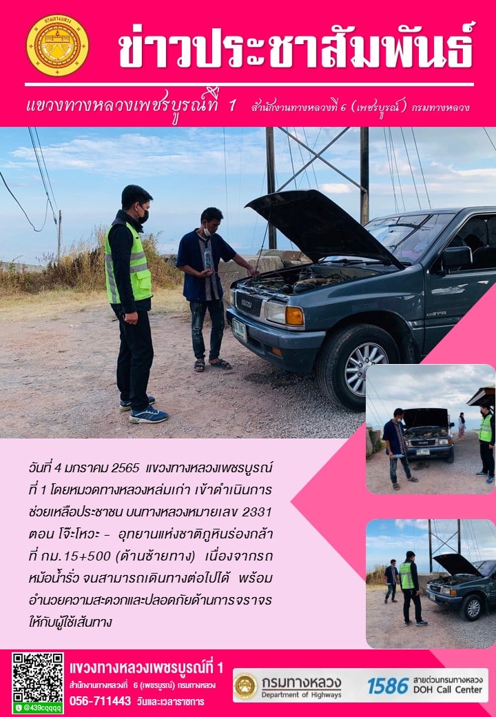 วันที่ 4 มกราคม 2565 แขวงทางหลวงเพชรบูรณ์ที่ 1 โดยหมวดทางหลวงหล่มเก่า เข้าดำเนินการช่วยเหลือประชาชน บนทางหลวงหมายเลข 2331 ตอน โจ๊ะโหวะ - อุทยานแห่งชาติภูหินร่องกล้า ที่ กม.15+500 (ด้านซ้ายทาง) เนื่องจากรถหม้อน้ำรั่ว จนสามารถเดินทางต่อไปได้ พร้อมอำนวยความสะดวกและปลอดภัยด้านการจราจรให้กับผู้ใช้เส้นทาง