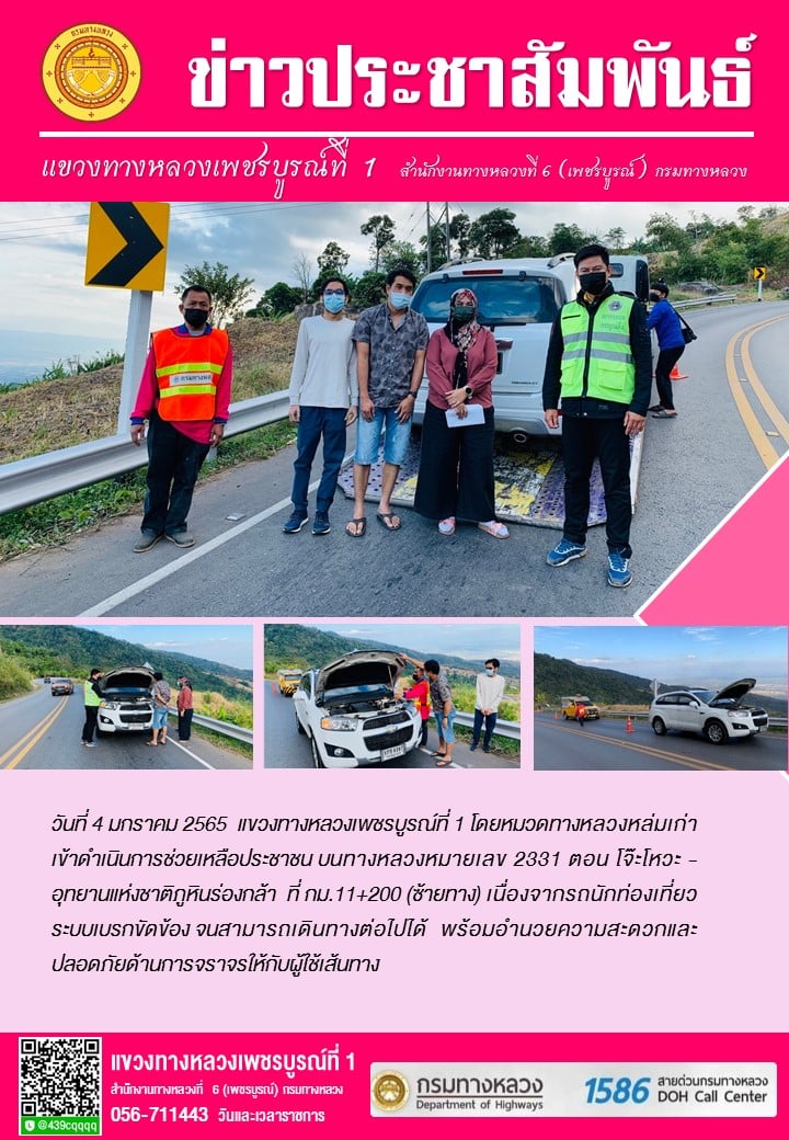 วันที่ 4 มกราคม 2565 แขวงทางหลวงเพชรบูรณ์ที่ 1 โดยหมวดทางหลวงหล่มเก่า เข้าดำเนินการช่วยเหลือประชาชน บนทางหลวงหมายเลข 2331 ตอน โจ๊ะโหวะ - อุทยานแห่งชาติภูหินร่องกล้า ที่ กม.11+200 (ซ้ายทาง) เนื่องจากรถนักท่องเที่ยวระบบเบรกขัดข้อง จนสามารถเดินทางต่อไปได้ พร้อมอำนวยความสะดวกและปลอดภัยด้านการจราจรให้กับผู้ใช้เส้นทาง