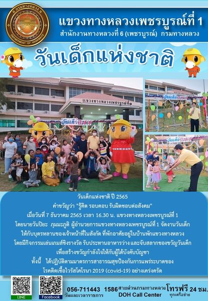 โดยนายวันปิยะ ภุมมะภูติ ผู้อำนวยการแขวงทางหลวงเพชรบูรณ์ที่ 1 จัดงานวันเด็กให้กับบุตรหลานของเจ้าหน้าที่ในสังกัด ที่พักอาศัยอยู่ในบ้านพักแขวงทางหลวง โดยมีกิจกรรมเล่นเกมส์ชิงรางวัล รับประทานอาหารว่าง และจับสลากของขวัญวันเด็ก เพื่อสร้างขวัญกำลังใจให้กับผู้ใต้บังคับบัญชา