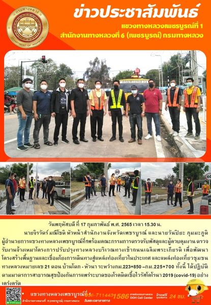 วันพฤหัสบดี ที่ 17 กุมภาพันธ์ พ.ศ. 2565 เวลา 15.30 น. นายจิรวัตร์ มณีโชติ หัวหน้าสำนักงานจังหวัดเพชรบูรณ์ และนายวันปิยะ ภุมมะภูติ ผู้อำนวยการแขวงทางหลวงเพชรบูรณ์ที่ 1 พร้อมคณะกรรมการตรวจรับพัสดุและผู้ควบคุมงาน ตรวจรับงานจ้างเหมาโครงการปรับปรุงทางหลวงบริเวณทางเข้าถนนเฉลิมพระเกียรติ เพื่อพัฒนาโครงสร้างพื้นฐานและเชื่อมโยงการเดินทางสู่แหล่งท่องเที่ยวในประเทศ และแหล่งท่องเที่ยวชุมชน ทางหลวงหมายเลข 21 ตอน บ้านโตก - หัวนา ระหว่างกม.223+850 –กม.225+700 ทั้งนี้ ได้ปฏิบัติตามมาตรการสาธารณสุขป้องกันการแพร่ระบาดของโรคติดเชื้อไวรัสโคโรนา 2019 (covid-19) อย่างเคร่งครัด
