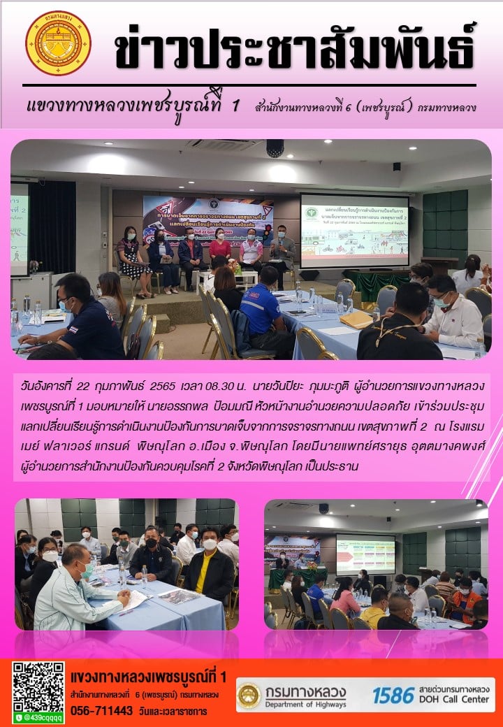 วันอังคารที่ 22 กุมภาพันธ์ 2565 เวลา 08.30 น. นายวันปิยะ ภุมมะภูติ ผู้อำนวยการแขวงทางหลวงเพชรบูรณ์ที่ 1 มอบหมายให้ นายอรรถพล ป้อมมณี หัวหน้างานอำนวยความปลอดภัย เข้าร่วมแลกเปลี่ยนเรียนรู้การดำเนินงานป้องกันการบาดเจ็บจากการจราจรทางถนน เขตสุขภาพที่ 2 ณ โรงแรมเมย์ ฟลาเวอร์ แกรนด์ พิษณุโลก อ.เมือง จ.พิษณุโลก โดยมีนายแพทย์ศรายุธ อุตตมางคพงศ์ ผู้อำนวยการสำนักงานป้องกันควบคุมโรคที่ 2 จังหวัดพิษณุโลก เป็นประธาน