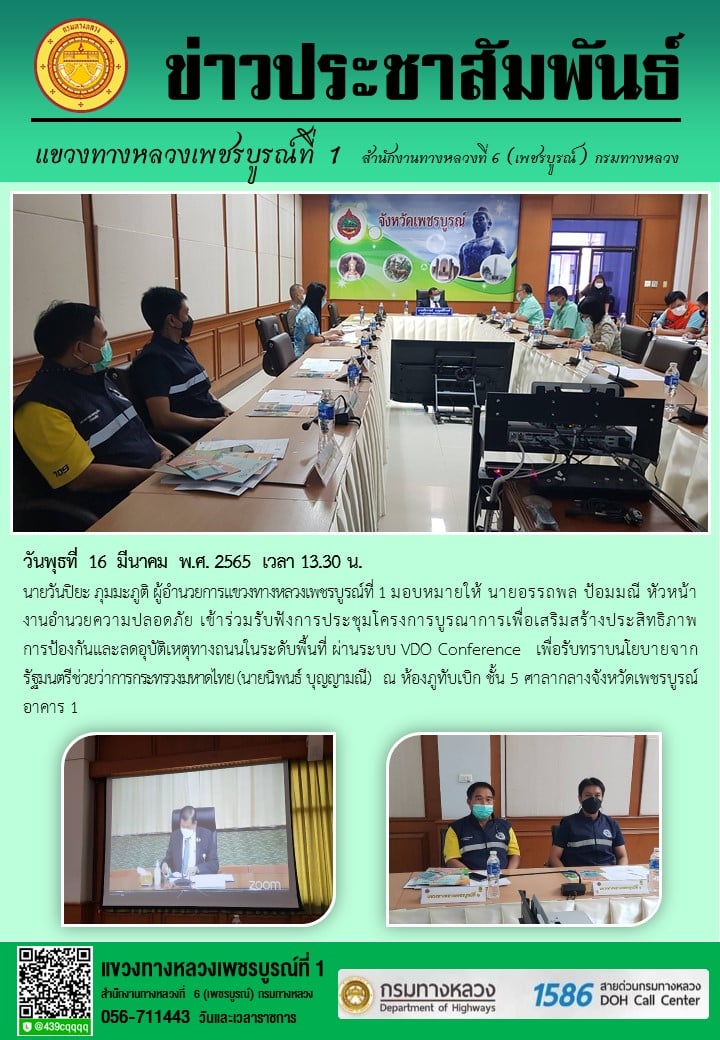 นายวันปิยะ ภุมมะภูติ ผู้อำนวยการแขวงทางหลวงเพชรบูรณ์ที่ 1 มอบหมายให้ นายอรรถพล ป้อมมณี หัวหน้างานอำนวยความปลอดภัย เข้าร่วมรับฟังการประชุมโครงการบูรณาการเพื่อเสริมสร้างประสิทธิภาพการป้องกันและลดอุบัติเหตุทางถนนในระดับพื้นที่ ผ่านระบบ VDO Conference เพื่อรับทราบนโยบายจากรัฐมนตรีช่วยว่าการกระทรวงมหาดไทย (นายนิพนธ์ บุญญามณี) ณ ห้องภูทับเบิก ชั้น 5 ศาลากลางจังหวัดเพชรบูรณ์ อาคาร 1