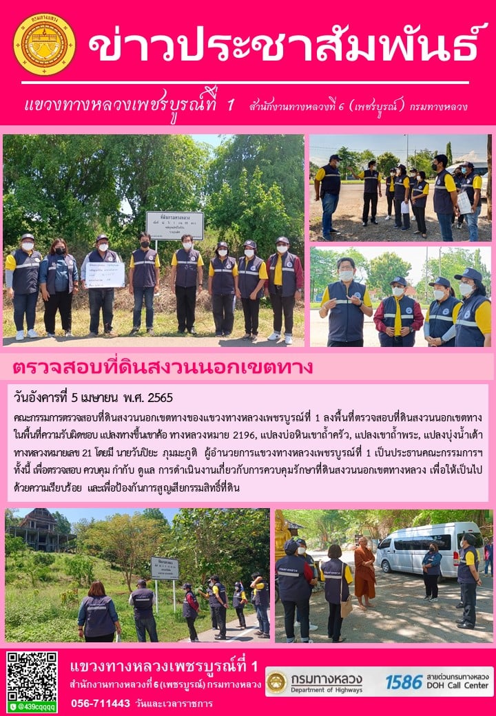 วันอังคารที่ 5 เมษายน พ.ศ. 2565 คณะกรรมการตรวจสอบที่ดินสงวนนอกเขตทางของแขวงทางหลวงเพชรบูรณ์ที่ 1 ลงพื้นที่ตรวจสอบที่ดินสงวนนอกเขตทางในพื้นที่ความรับผิดชอบ แปลงทางขึ้นเขาค้อ ทางหลวงหมาย 2196, แปลงบ่อหินเขาถ้ำครัว, แปลงเขาถ้ำพระ, แปลงบุ่งน้ำเต้า ทางหลวงหมายเลข 21 โดยมี นายวันปิยะ ภุมมะภูติ ผู้อำนวยการแขวงทางหลวงเพชรบูรณ์ที่ 1 เป็นประธานคณะกรรมการฯ ทั้งนี้ เพื่อตรวจสอบ ควบคุม กำกับ ดูแล การดำเนินงานเกี่ยวกับการควบคุมรักษาที่ดินสงวนนอกเขตทางหลวง เพื่อให้เป็นไปด้วยความเรียบร้อย และเพื่อป้องกันการสูญเสียกรรมสิทธิ์ที่ดิน