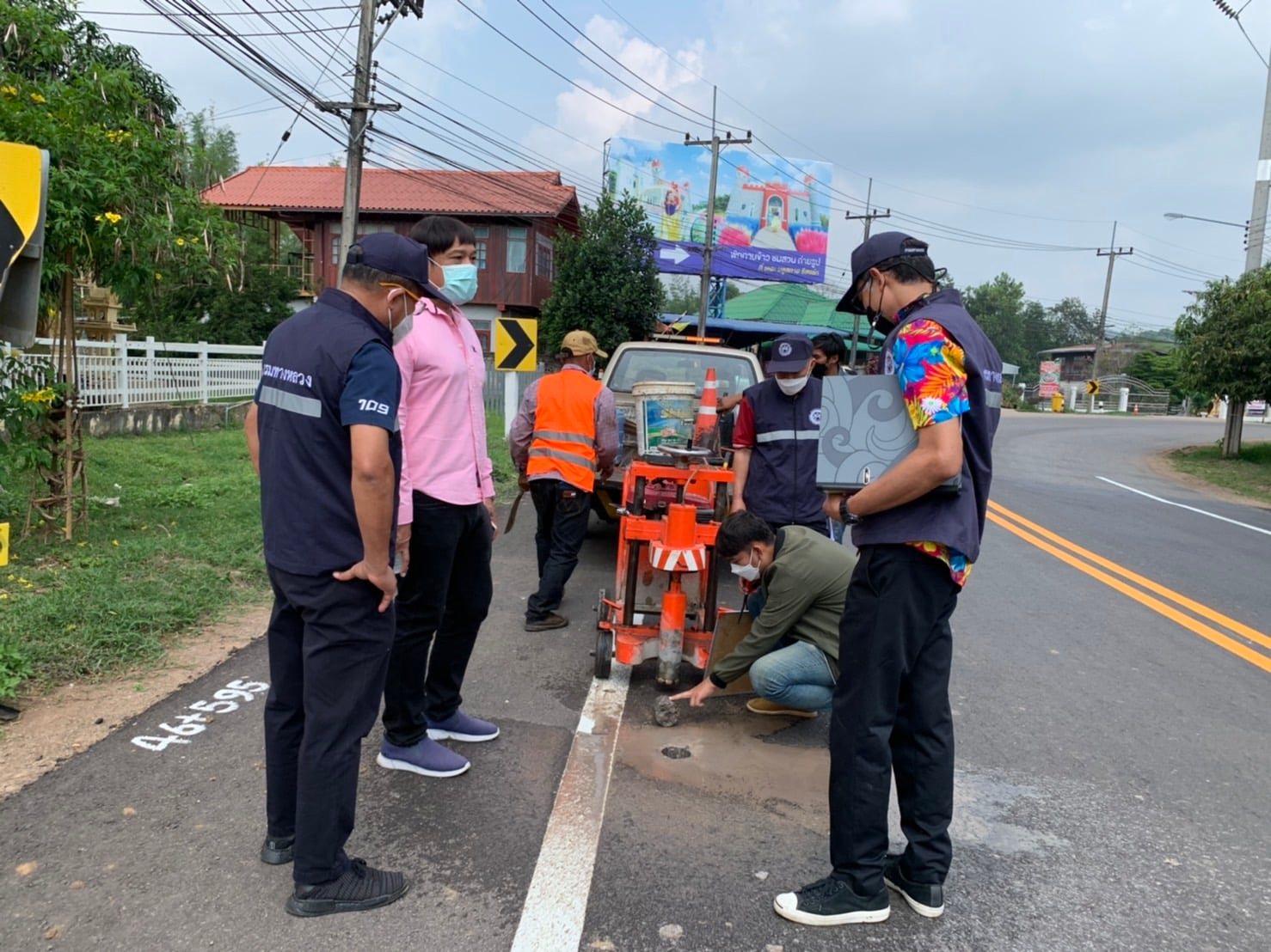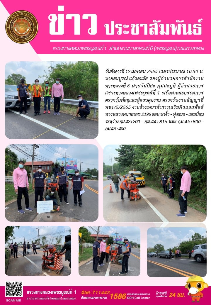 วันอังคารที่ 12 เมษายน 2565 เวลาประมาณ 10.30 น. นายสมบูรณ์ แก้วละมัย รองผู้อำนวยการสำนักงานทางหลวงที่ 6 นายวันปิยะ ภุมมะภูติ ผู้อำนวยการแขวงทางหลวงเพชรบูรณ์ที่ 1 พร้อมคณะกรรมการตรวจรับพัสดุและผู้ควบคุมงาน ตรวจรับงานสัญญาที่ พช1/5/2565 งานจ้างเหมาทำการเสริมผิวแอสฟัลต์ ทางหลวงหมายเลข 2196 ตอน นางั่ว - ทุ่งสมอ - แคมป์สน ระหว่าง กม.42+200 - กม.44+815 และ กม.45+800 - กม.46+400