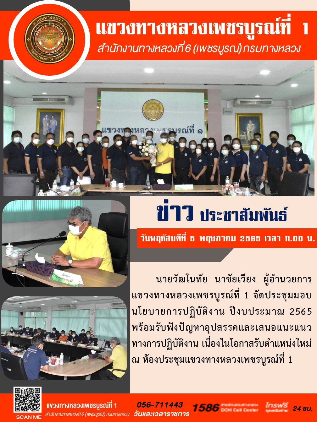วันพฤหัสบดีที่ 5 พฤษภาคม 2565 เวลา 11.00 น. นายวัฒโนทัย นาชัยเวียง ผู้อำนวยการแขวงทางหลวงเพชรบูรณ์ที่ 1 จัดประชุมมอบนโยบายการปฏิบัติงาน ปีงบประมาณ 2565 พร้อมรับฟังปัญหาอุปสรรคและเสนอแนะแนวทางการปฏิบัติงาน เนื่องในโอกาสรับตำแหน่งใหม่ ณ ห้องประชุมแขวงทางหลวงเพชรบูรณ์ที่ 1