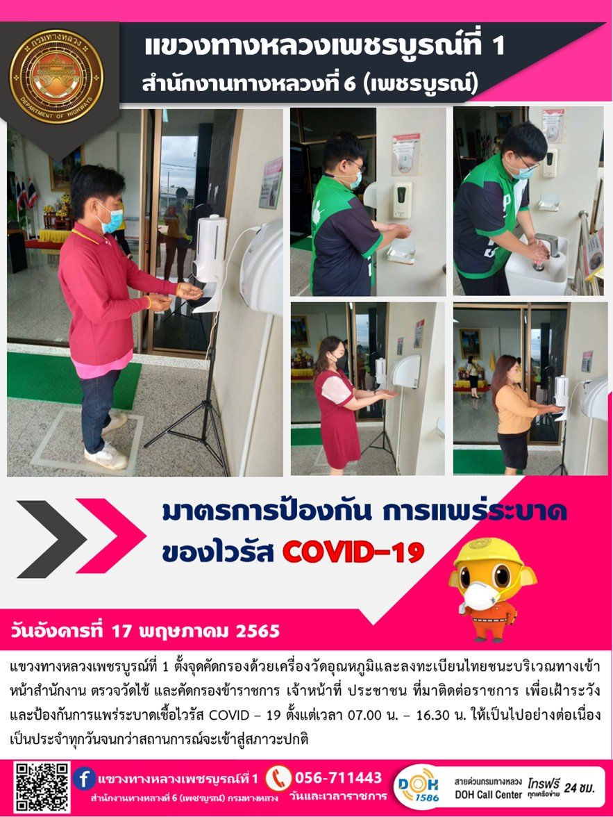 วันพุธที่ 17 พฤษภาคม 2565 แขวงทางหลวงเพชรบูรณ์ที่ 1 ตั้งจุดคัดกรองด้วยเครื่องวัดอุณหภูมิและลงทะเบียนไทยชนะ บริเวณทางเข้าหน้าสำนักงาน ตรวจวัดไข้ และคัดกรองข้าราชการ เจ้าหน้าที่ ประชาชน ที่มาติดต่อราชการ เพื่อเฝ้าระวังและป้องกันการแพร่ระบาดเชื้อไวรัส COVID – 19 ตั้งแต่เวลา 07.00 น. – 16.30 น. ให้เป็นไปอย่างต่อเนื่อง เป็นประจำทุกวันจนกว่าสถานการณ์จะเข้าสู่สภาวะปกติ