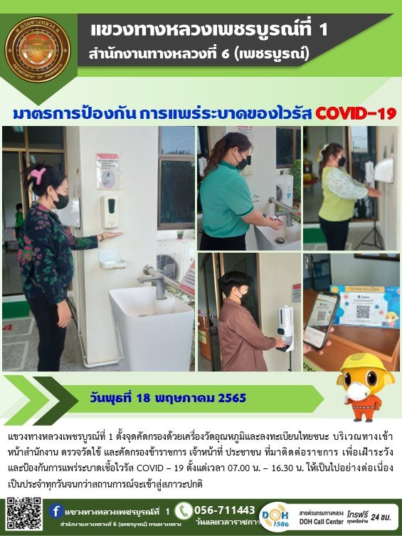 วันพุธที่ 18 พฤษภาคม 2565 แขวงทางหลวงเพชรบูรณ์ที่ 1 ตั้งจุดคัดกรองด้วยเครื่องวัดอุณหภูมิและลงทะเบียนไทยชนะ บริเวณทางเข้าหน้าสำนักงาน ตรวจวัดไข้ และคัดกรองข้าราชการ เจ้าหน้าที่ ประชาชน ที่มาติดต่อราชการ เพื่อเฝ้าระวังและป้องกันการแพร่ระบาดเชื้อไวรัส COVID – 19 ตั้งแต่เวลา 07.00 น. – 16.30 น. ให้เป็นไปอย่างต่อเนื่อง เป็นประจำทุกวันจนกว่าสถานการณ์จะเข้าสู่สภาวะปกติ