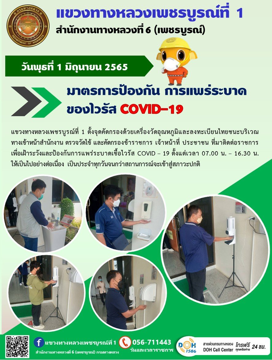 นพุธที่ 1 มิถุนายน 2565 แขวงทางหลวงเพชรบูรณ์ที่ 1 ตั้งจุดคัดกรองด้วยเครื่องวัดอุณหภูมิและลงทะเบียนไทยชนะ บริเวณทางเข้าหน้าสำนักงาน ตรวจวัดไข้ และคัดกรองข้าราชการ เจ้าหน้าที่ ประชาชน ที่มาติดต่อราชการ เพื่อเฝ้าระวังและป้องกันการแพร่ระบาดเชื้อไวรัส COVID – 19 ตั้งแต่เวลา 07.00 น. – 16.30 น. ให้เป็นไปอย่างต่อเนื่อง เป็นประจำทุกวันจนกว่าสถานการณ์จะเข้าสู่สภาวะปกติ