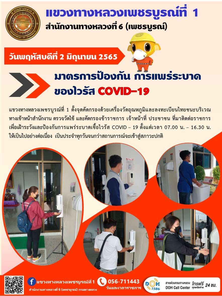 วันพฤหัสบดีที่ 2 มิถุนายน 2565 แขวงทางหลวงเพชรบูรณ์ที่ 1 ตั้งจุดคัดกรองด้วยเครื่องวัดอุณหภูมิและลงทะเบียนไทยชนะ บริเวณทางเข้าหน้าสำนักงาน ตรวจวัดไข้ และคัดกรองข้าราชการ เจ้าหน้าที่ ประชาชน ที่มาติดต่อราชการ เพื่อเฝ้าระวังและป้องกันการแพร่ระบาดเชื้อไวรัส COVID – 19 ตั้งแต่เวลา 07.00 น. – 16.30 น. ให้เป็นไปอย่างต่อเนื่อง เป็นประจำทุกวันจนกว่าสถานการณ์จะเข้าสู่สภาวะปกติ