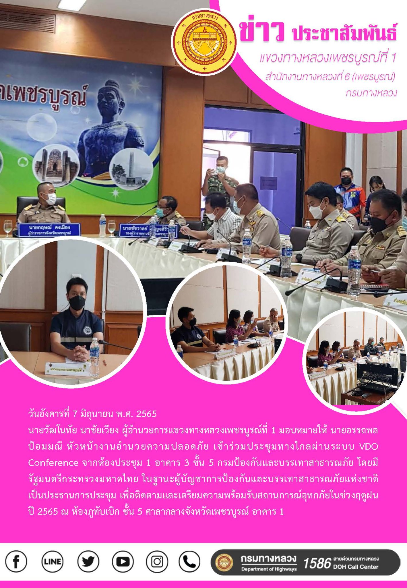 นายวัฒโนทัย นาชัยเวียง ผู้อำนวยการแขวงทางหลวงเพชรบูรณ์ที่ 1 มอบหมายให้ นายอรรถพล ป้อมมณี หัวหน้างานอำนวยความปลอดภัย เข้าร่วมประชุมทางไกลผ่านระบบ VDO Conference จากห้องประชุม 1 อาคาร 3 ชั้น 5 กรมป้องกันและบรรเทาสาธารณภัย โดยมีรัฐมนตรีกระทรวงมหาดไทย ในฐานะผู้บัญชาการป้องกันและบรรเทาสาธารณภัยแห่งชาติ เป็นประธานการประชุม เพื่อติดตามและเตรียมความพร้อมรับสถานการณ์อุทกภัยในช่วงฤดูฝน ปี 2565 ณ ห้องภูทับเบิก ชั้น 5 ศาลากลางจังหวัดเพชรบูรณ์ อาคาร 1