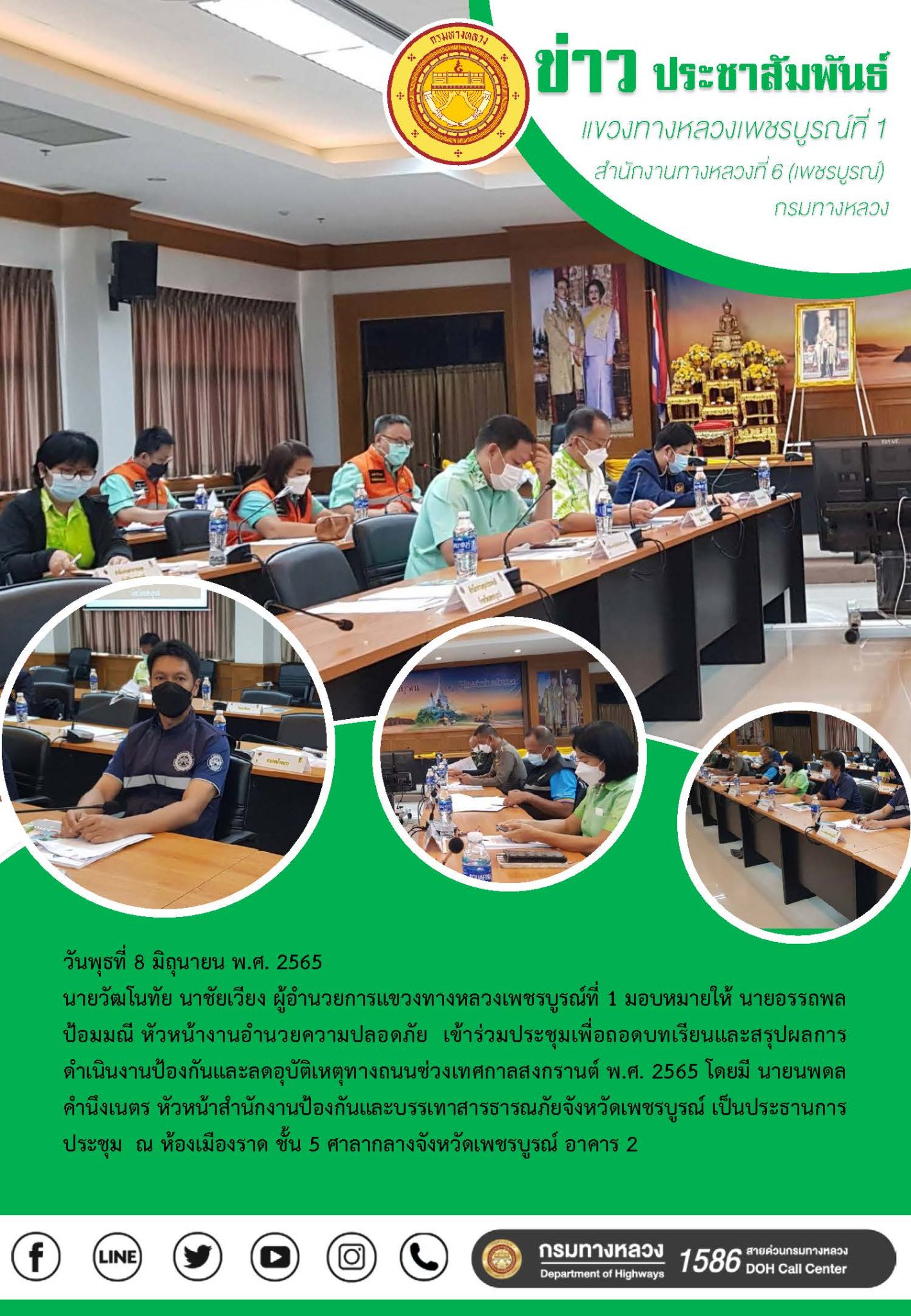 นายวัฒโนทัย นาชัยเวียง ผู้อำนวยการแขวงทางหลวงเพชรบูรณ์ที่ 1 มอบหมายให้ นายอรรถพล ป้อมมณี หัวหน้างานอำนวยความปลอดภัย เข้าร่วมประชุมเพื่อถอดบทเรียนและสรุปผลการดำเนินงานป้องกันและลดอุบัติเหตุทางถนนช่วงเทศกาลสงกรานต์ พ.ศ. 2565 โดยมี นายนพดล คำนึงเนตร หัวหน้าสำนักงานป้องกันและบรรเทาสารธารณภัยจังหวัดเพชรบูรณ์ เป็นประธานการประชุม ณ ห้องเมืองราด ชั้น 5 ศาลากลางจังหวัดเพชรบูรณ์ อาคาร 2