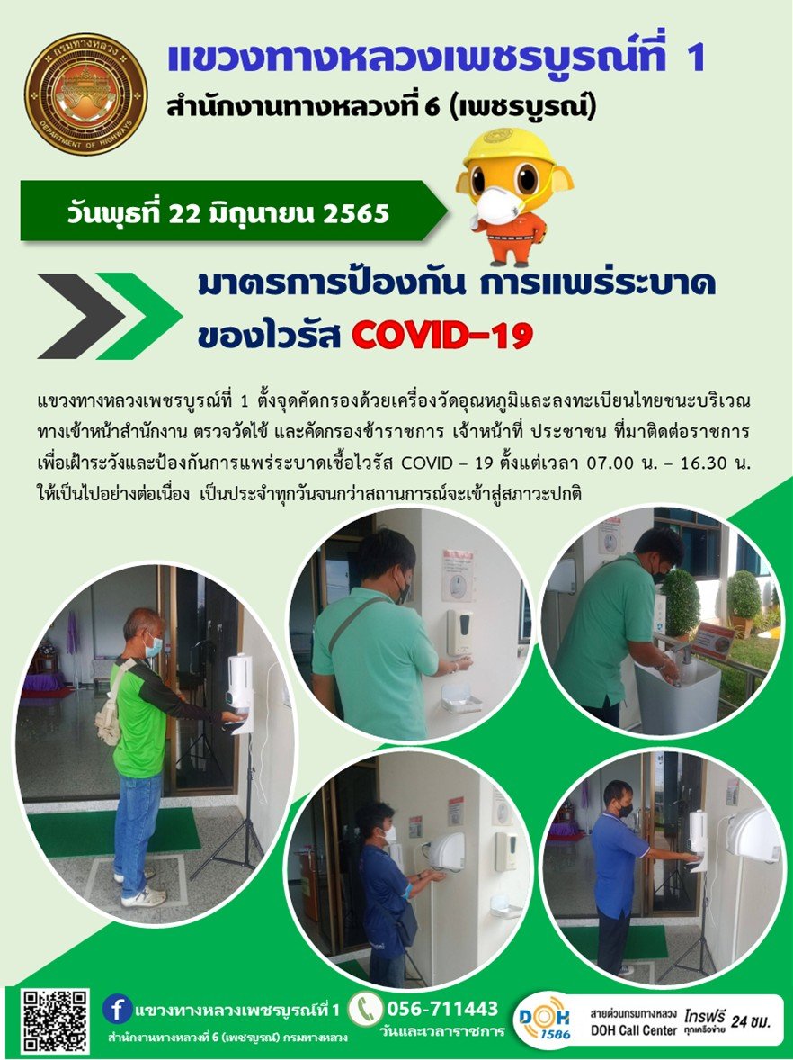 วันพุธที่ 22 มิถุนายน 2565 แขวงทางหลวงเพชรบูรณ์ที่ 1 ตั้งจุดคัดกรองด้วยเครื่องวัดอุณหภูมิและลงทะเบียนไทยชนะ บริเวณทางเข้าหน้าสำนักงาน ตรวจวัดไข้ และคัดกรองข้าราชการ เจ้าหน้าที่ ประชาชน ที่มาติดต่อราชการ เพื่อเฝ้าระวังและป้องกันการแพร่ระบาดเชื้อไวรัส COVID – 19 ตั้งแต่เวลา 07.00 น. – 16.30 น. ให้เป็นไปอย่างต่อเนื่อง เป็นประจำทุกวันจนกว่าสถานการณ์จะเข้าสู่สภาวะปกติ