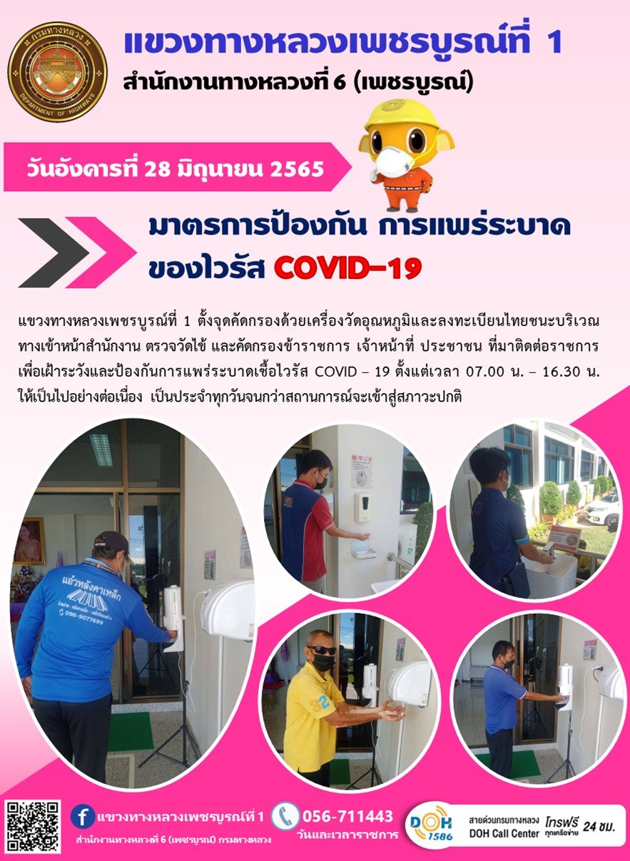 วันอังคารที่ 28 มิถุนายน 2565 แขวงทางหลวงเพชรบูรณ์ที่ 1 ตั้งจุดคัดกรองด้วยเครื่องวัดอุณหภูมิและลงทะเบียนไทยชนะ บริเวณทางเข้าหน้าสำนักงาน ตรวจวัดไข้ และคัดกรองข้าราชการ เจ้าหน้าที่ ประชาชน ที่มาติดต่อราชการ เพื่อเฝ้าระวังและป้องกันการแพร่ระบาดเชื้อไวรัส COVID – 19 ตั้งแต่เวลา 07.00 น. – 16.30 น. ให้เป็นไปอย่างต่อเนื่อง เป็นประจำทุกวันจนกว่าสถานการณ์จะเข้าสู่สภาวะปกติ