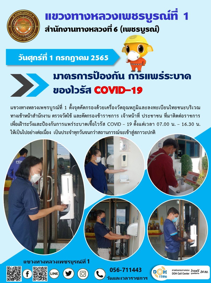วันศุกร์ที่ 1 กรกฎาคม 2565 แขวงทางหลวงเพชรบูรณ์ที่ 1 ตั้งจุดคัดกรองด้วยเครื่องวัดอุณหภูมิและลงทะเบียนไทยชนะ บริเวณทางเข้าหน้าสำนักงาน ตรวจวัดไข้ และคัดกรองข้าราชการ เจ้าหน้าที่ ประชาชน ที่มาติดต่อราชการ เพื่อเฝ้าระวังและป้องกันการแพร่ระบาดเชื้อไวรัส COVID – 19 ตั้งแต่เวลา 07.00 น. – 16.30 น. ให้เป็นไปอย่างต่อเนื่อง เป็นประจำทุกวันจนกว่าสถานการณ์จะเข้าสู่สภาวะปกติ