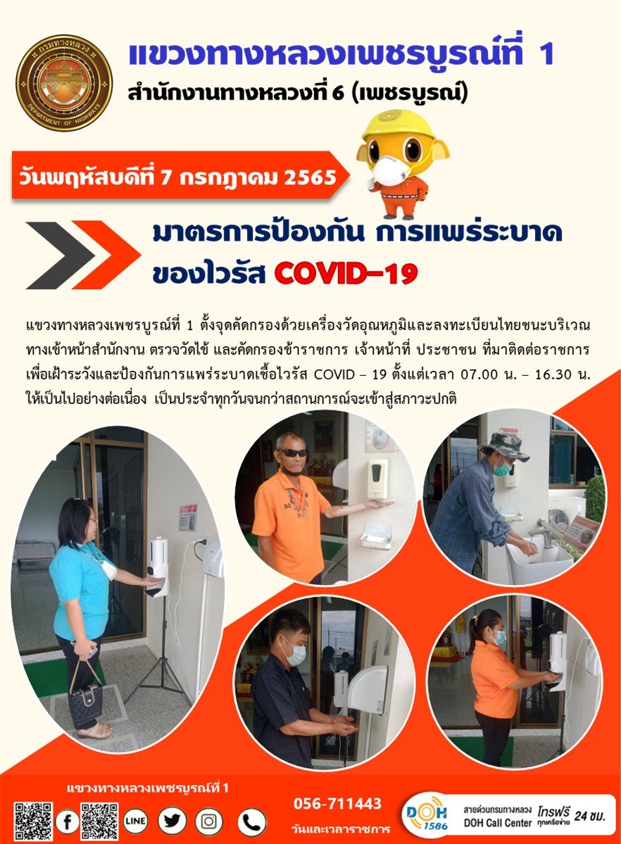 วันพฤหัสบดีที่ 7 กรกฎาคม 2565 แขวงทางหลวงเพชรบูรณ์ที่ 1 ตั้งจุดคัดกรองด้วยเครื่องวัดอุณหภูมิและลงทะเบียนไทยชนะ บริเวณทางเข้าหน้าสำนักงาน ตรวจวัดไข้ และคัดกรองข้าราชการ เจ้าหน้าที่ ประชาชน ที่มาติดต่อราชการ เพื่อเฝ้าระวังและป้องกันการแพร่ระบาดเชื้อไวรัส COVID – 19 ตั้งแต่เวลา 07.00 น. – 16.30 น. ให้เป็นไปอย่างต่อเนื่อง เป็นประจำทุกวันจนกว่าสถานการณ์จะเข้าสู่สภาวะปกติ