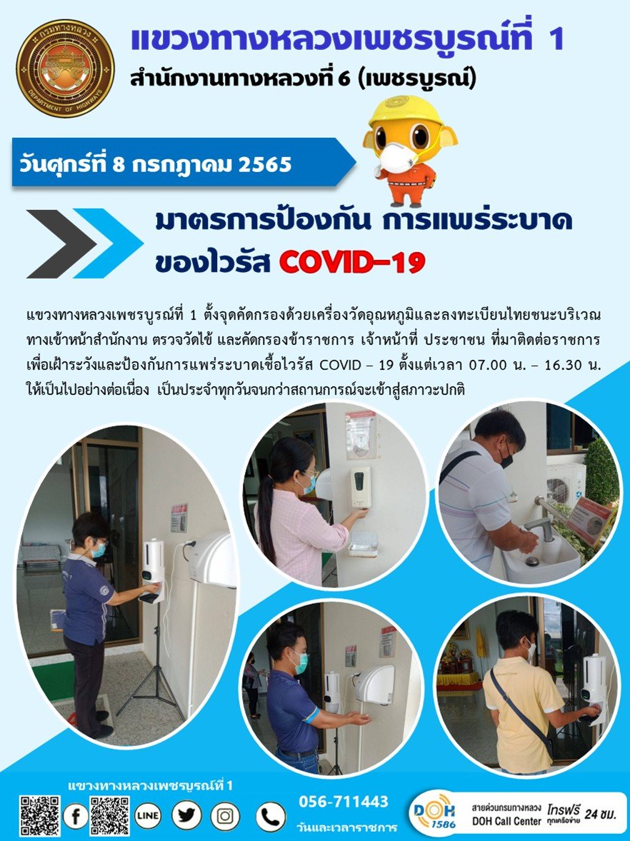วันศุกร์ที่ 8 กรกฎาคม 2565 แขวงทางหลวงเพชรบูรณ์ที่ 1 ตั้งจุดคัดกรองด้วยเครื่องวัดอุณหภูมิและลงทะเบียนไทยชนะ บริเวณทางเข้าหน้าสำนักงาน ตรวจวัดไข้ และคัดกรองข้าราชการ เจ้าหน้าที่ ประชาชน ที่มาติดต่อราชการ เพื่อเฝ้าระวังและป้องกันการแพร่ระบาดเชื้อไวรัส COVID – 19 ตั้งแต่เวลา 07.00 น. – 16.30 น. ให้เป็นไปอย่างต่อเนื่อง เป็นประจำทุกวันจนกว่าสถานการณ์จะเข้าสู่สภาวะปกติ