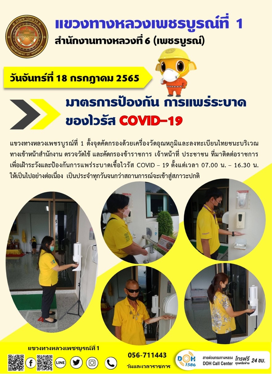 วันจันทร์ที่ 18 กรกฎาคม 2565 แขวงทางหลวงเพชรบูรณ์ที่ 1 ตั้งจุดคัดกรองด้วยเครื่องวัดอุณหภูมิและลงทะเบียนไทยชนะ บริเวณทางเข้าหน้าสำนักงาน ตรวจวัดไข้ และคัดกรองข้าราชการ เจ้าหน้าที่ ประชาชน ที่มาติดต่อราชการ เพื่อเฝ้าระวังและป้องกันการแพร่ระบาดเชื้อไวรัส COVID – 19 ตั้งแต่เวลา 07.00 น. – 16.30 น. ให้เป็นไปอย่างต่อเนื่อง เป็นประจำทุกวันจนกว่าสถานการณ์จะเข้าสู่สภาวะปกติ