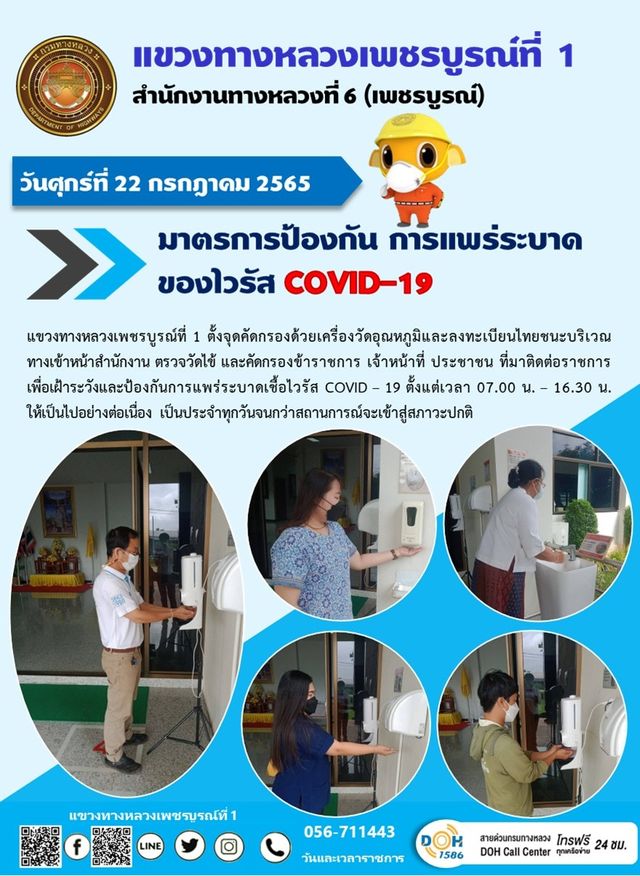 วันศุกร์ที่ 22 กรกฎาคม 2565 แขวงทางหลวงเพชรบูรณ์ที่ 1 ตั้งจุดคัดกรองด้วยเครื่องวัดอุณหภูมิและลงทะเบียนไทยชนะ บริเวณทางเข้าหน้าสำนักงาน ตรวจวัดไข้ และคัดกรองข้าราชการ เจ้าหน้าที่ ประชาชน ที่มาติดต่อราชการ เพื่อเฝ้าระวังและป้องกันการแพร่ระบาดเชื้อไวรัส COVID – 19 ตั้งแต่เวลา 07.00 น. – 16.30 น. ให้เป็นไปอย่างต่อเนื่อง เป็นประจำทุกวันจนกว่าสถานการณ์จะเข้าสู่สภาวะปกติ