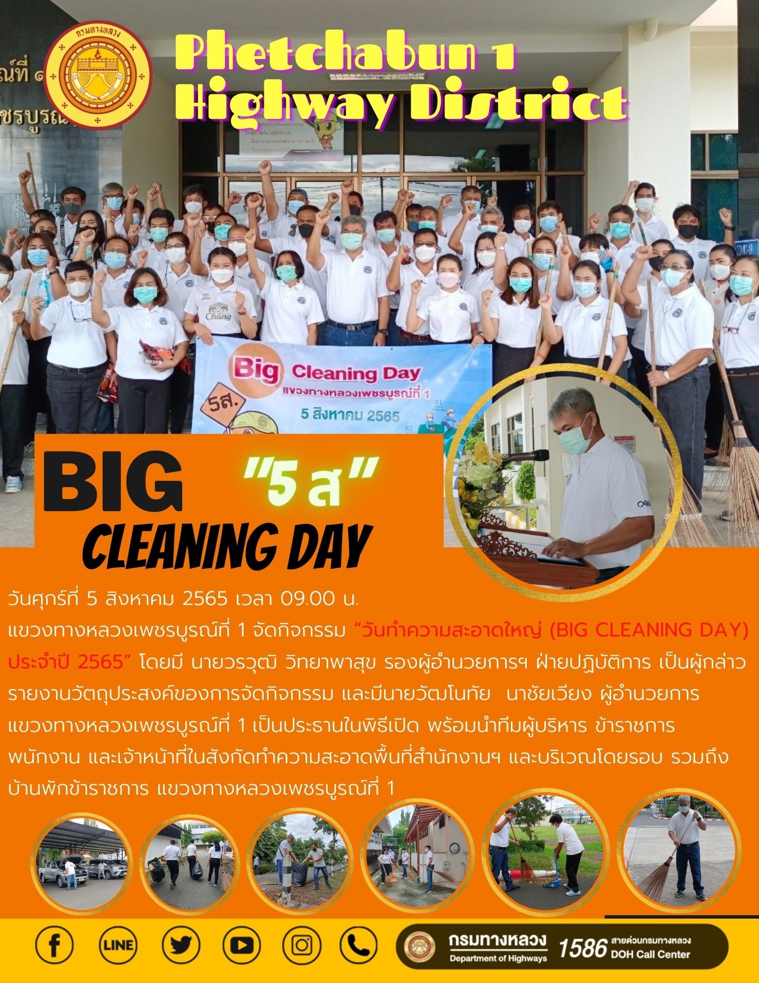 แขวงทางหลวงเพชรบูรณ์ที่ 1 จัดกิจกรรม “วันทำความสะอาดใหญ่ (Big Cleaning Day) ประจำปี 2565” โดยมี นายวรวุฒิ วิทยาพาสุข รองผู้อำนวยการฯ ฝ่ายปฏิบัติการ เป็นผู้กล่าวรายงานวัตถุประสงค์ของการจัดกิจกรรม และมีนายวัฒโนทัย นาชัยเวียง ผู้อำนวยการแขวงทางหลวงเพชรบูรณ์ที่ 1 เป็นประธานในพิธีเปิด พร้อมนำทีมผู้บริหาร ข้าราชการ พนักงาน และเจ้าหน้าที่ในสังกัดทำความสะอาดพื้นที่สำนักงานฯ และบริเวณโดยรอบ รวมถึงบ้านพักข้าราชการ แขวงทางหลวงเพชรบูรณ์ที่ 1