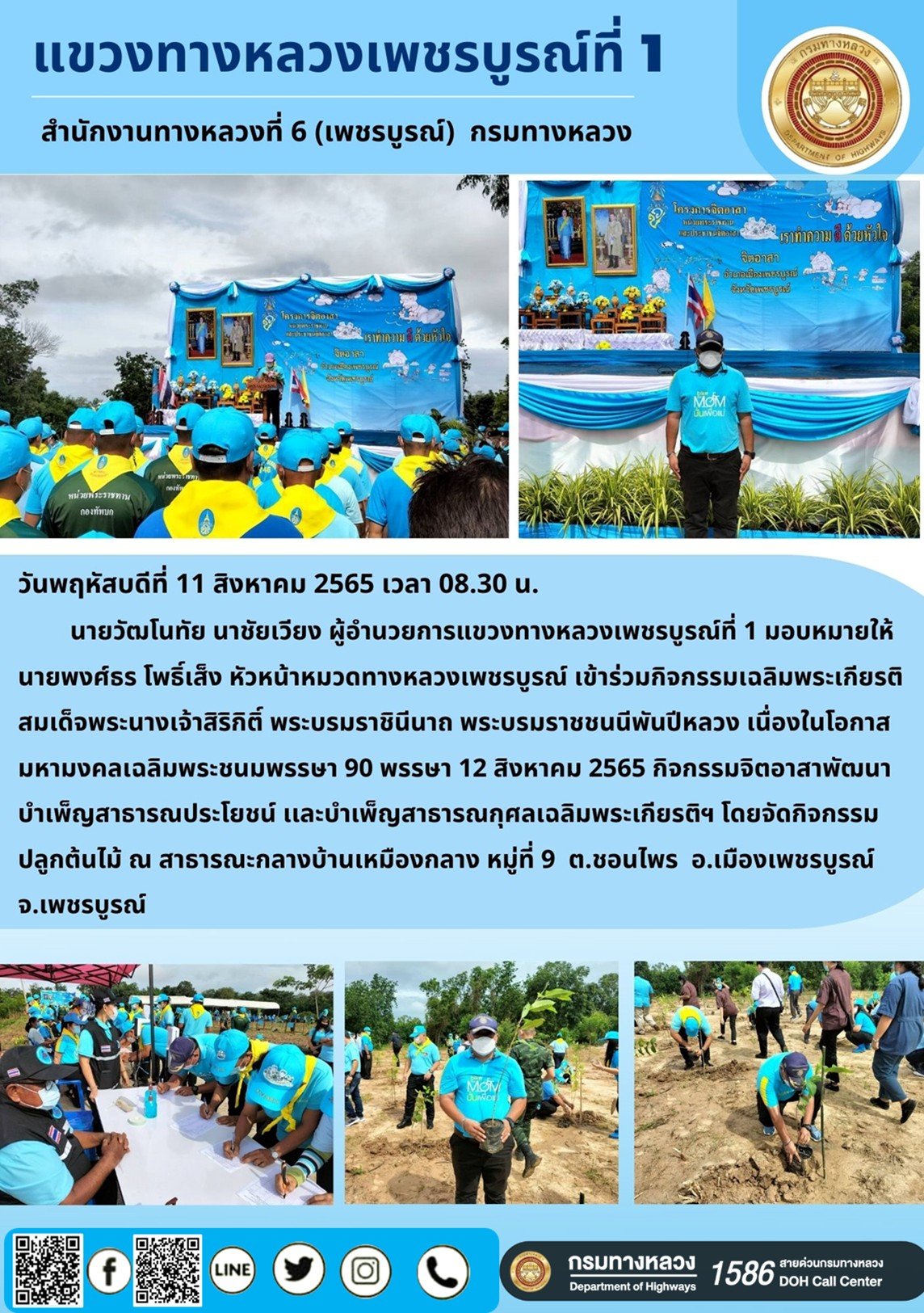 วันพฤหัสบดีที่ 11 สิงหาคม 2565 เวลา 08.30 น. นายวัฒโนทัย นาชัยเวียง ผู้อำนวยการแขวงทางหลวงเพชรบูรณ์ที่ 1 มอบหมายให้ นายพงศ์ธร โพธิ์เส็ง หัวหน้าหมวดทางหลวงเพชรบูรณ์ เข้าร่วมกิจกรรมเฉลิมพระเกียรติสมเด็จพระนางเจ้าสิริกิติ์ พระบรมราชินีนาถ พระบรมราชชนนีพันปีหลวง เนื่องในโอกาสมหามงคลเฉลิมพระชนมพรรษา 90 พรรษา 12 สิงหาคม 2565 กิจกรรมจิตอาสาพัฒนาบำเพ็ญสาธารณประโยชน์ เเละบำเพ็ญสาธารณกุศลเฉลิมพระเกียรติฯ โดยจัดกิจกรรมปลูกต้นไม้ ณ สาธารณะกลางบ้านเหมืองกลาง หมู่ที่ 9 ต.ชอนไพร อ.เมืองเพชรบูรณ์ จ.เพชรบูรณ์