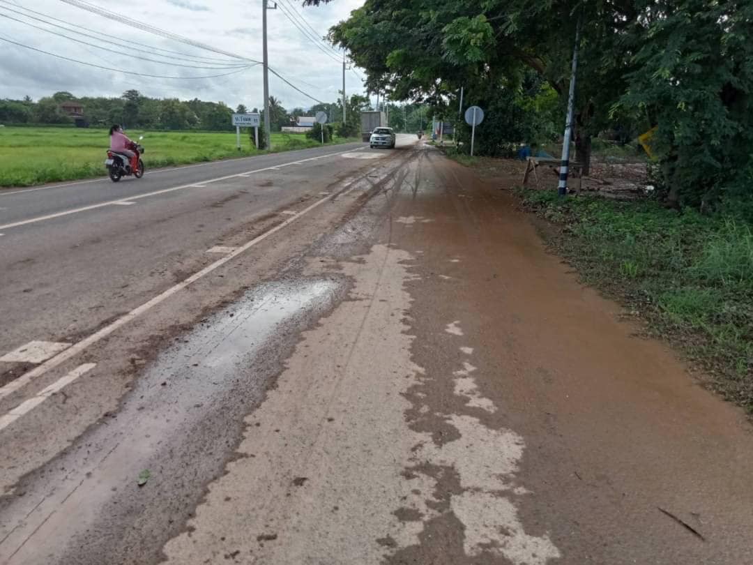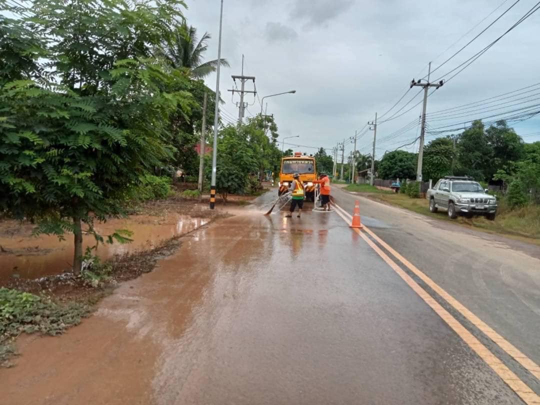 เจ้าหน้าที่หมวดฯ ดำเนินการฉีดล้างดินโคลนและทำความสะอาดผิวทาง เพื่ออำนวยความสะดวกและปลอดภัยแก่ประชาชนผู้ใช้เส้นทาง