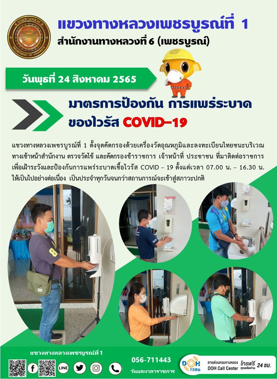 วันพุธที่ 24 สิงหาคม 2565 แขวงทางหลวงเพชรบูรณ์ที่ 1 ตั้งจุดคัดกรองด้วยเครื่องวัดอุณหภูมิและลงทะเบียนไทยชนะบริเวณทางเข้าหน้าสำนักงาน ตรวจวัดไข้ และคัดกรองข้าราชการ เจ้าหน้าที่ ประชาชน ที่มาติดต่อราชการเพื่อเฝ้าระวังและป้องกันการแพร่ระบาดเชื้อไวรัส COVID – 19 ตั้งแต่เวลา 07.00 น. – 16.30 น. ให้เป็นไปอย่างต่อเนื่อง เป็นประจำทุกวันจนกว่าสถานการณ์จะเข้าสู่สภาวะปกติ