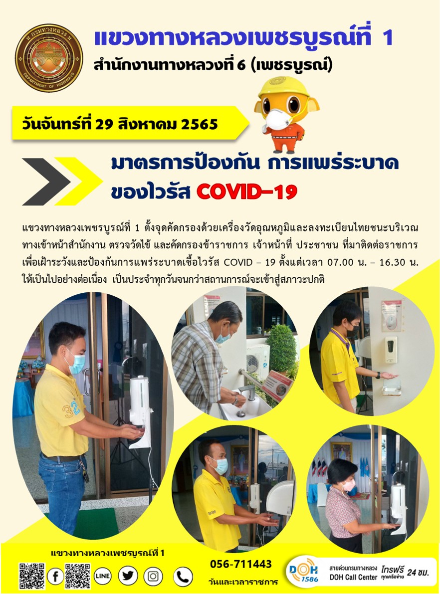 วันจันทร์ที่ 29 สิงหาคม 2565 แขวงทางหลวงเพชรบูรณ์ที่ 1 ตั้งจุดคัดกรองด้วยเครื่องวัดอุณหภูมิและลงทะเบียนไทยชนะบริเวณทางเข้าหน้าสำนักงาน ตรวจวัดไข้ และคัดกรองข้าราชการ เจ้าหน้าที่ ประชาชน ที่มาติดต่อราชการเพื่อเฝ้าระวังและป้องกันการแพร่ระบาดเชื้อไวรัส COVID – 19 ตั้งแต่เวลา 07.00 น. – 16.30 น. ให้เป็นไปอย่างต่อเนื่อง เป็นประจำทุกวันจนกว่าสถานการณ์จะเข้าสู่สภาวะปกติ