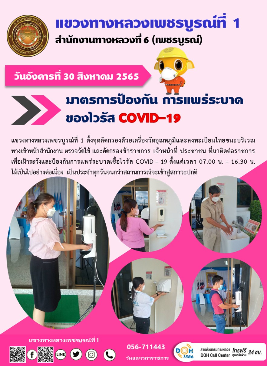 วันอังคารที่ 30 สิงหาคม 2565 แขวงทางหลวงเพชรบูรณ์ที่ 1 ตั้งจุดคัดกรองด้วยเครื่องวัดอุณหภูมิและลงทะเบียนไทยชนะบริเวณทางเข้าหน้าสำนักงาน ตรวจวัดไข้ และคัดกรองข้าราชการ เจ้าหน้าที่ ประชาชน ที่มาติดต่อราชการเพื่อเฝ้าระวังและป้องกันการแพร่ระบาดเชื้อไวรัส COVID – 19 ตั้งแต่เวลา 07.00 น. – 16.30 น. ให้เป็นไปอย่างต่อเนื่อง เป็นประจำทุกวันจนกว่าสถานการณ์จะเข้าสู่สภาวะปกติ