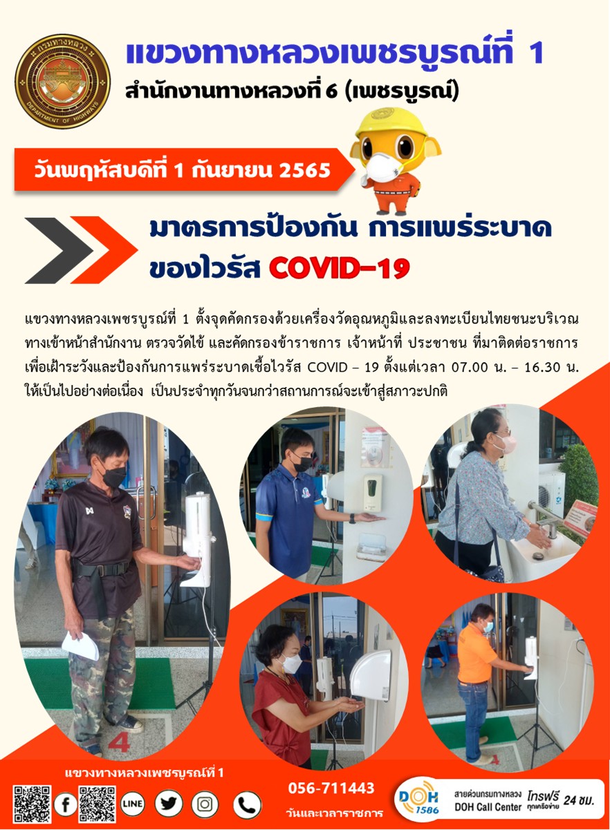 วันพฤหัสบดีที่ 1 กันยายน 2565 แขวงทางหลวงเพชรบูรณ์ที่ 1 ตั้งจุดคัดกรองด้วยเครื่องวัดอุณหภูมิและลงทะเบียนไทยชนะบริเวณทางเข้าหน้าสำนักงาน ตรวจวัดไข้ และคัดกรองข้าราชการ เจ้าหน้าที่ ประชาชน ที่มาติดต่อราชการเพื่อเฝ้าระวังและป้องกันการแพร่ระบาดเชื้อไวรัส COVID – 19 ตั้งแต่เวลา 07.00 น. – 16.30 น. ให้เป็นไปอย่างต่อเนื่อง เป็นประจำทุกวันจนกว่าสถานการณ์จะเข้าสู่สภาวะปกติ