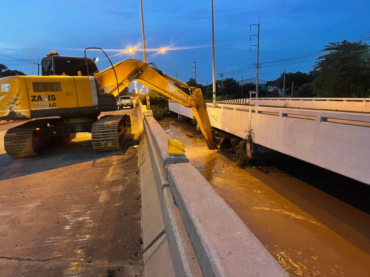 -เครื่องจักรอยู่ระหว่างดำเนินการขุดลอกเศษสวะใต้สะพานเพื่อเปิดช่องระบายน้ำ
