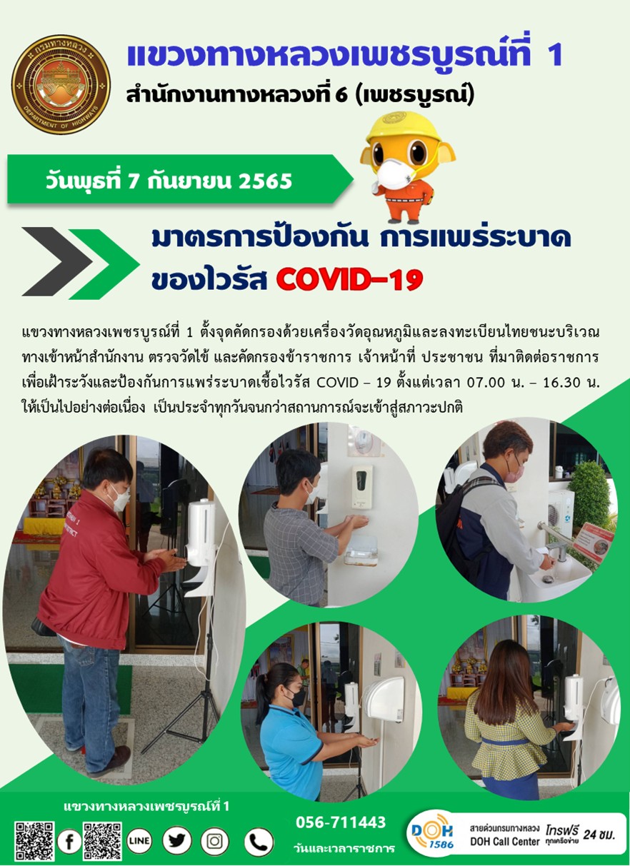 วันพุธที่ 7 กันยายน 2565 แขวงทางหลวงเพชรบูรณ์ที่ 1 ตั้งจุดคัดกรองด้วยเครื่องวัดอุณหภูมิและลงทะเบียนไทยชนะบริเวณทางเข้าหน้าสำนักงาน ตรวจวัดไข้ และคัดกรองข้าราชการ เจ้าหน้าที่ ประชาชน ที่มาติดต่อราชการเพื่อเฝ้าระวังและป้องกันการแพร่ระบาดเชื้อไวรัส COVID – 19 ตั้งแต่เวลา 07.00 น. – 16.30 น. ให้เป็นไปอย่างต่อเนื่อง เป็นประจำทุกวันจนกว่าสถานการณ์จะเข้าสู่สภาวะปกติ