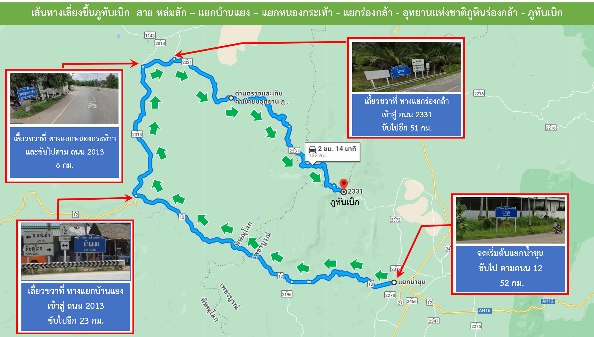 อย่างไรก็ตาม ช่วงนี้ยังคงมีฝนตกในพื้นที่ จึงขอประชาสัมพันธ์ให้ผู้ใช้เส้นทางและนักท่องเที่ยวที่จำเป็นต้องใช้เส้นทางนี้ โปรดใช้ความระมัดระวังในการเดินทางเป็นพิเศษ พร้อมขอให้ปฏิบัติตามป้ายเตือน ป้ายแนะนำและคำแนะนำของเจ้าหน้าที่อย่างเคร่งครัด หรือหลีกเลี่ยงเส้นทางที่คาดว่าจะเกิดความสุ่มเสี่ยง โดยใช้เส้นทางเลี่ยง สาย 12 (หล่มสัก - แยกบ้านแยง) เลี้ยวขวาไป สาย 2013 (บ้านแยง – แยกหนองกระท้าว) เลี้ยวขวาไป สาย 2331 (แยกหนองกะท้าว – อุทยานแห่งชาติภูหินร่องกล้า - ภูทับเบิก) แทน