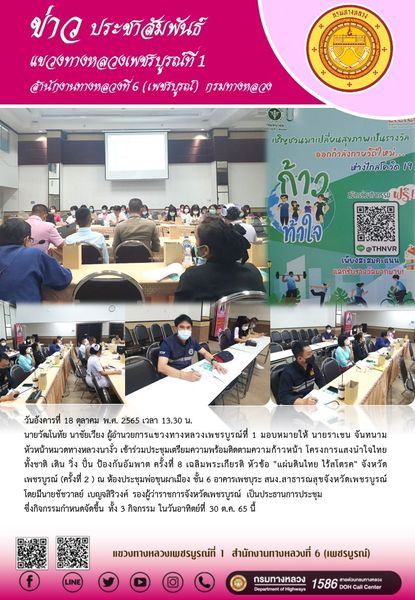 นายวัฒโนทัย นาชัยเวียง ผู้อำนวยการแขวงทางหลวงเพชรบูรณ์ที่ 1 มอบหมายให้ นายราเชน จันทนาม หัวหน้าหมวดทางหลวงนางั่ว เข้าร่วมประชุมเตรียมความพร้อมติดตามความก้าวหน้า โครงการแสงนำใจไทยทั้งชาติ เดิน วิ่ง ปั่น ป้องกันอัมพาต ครั้งที่ 8 เฉลิมพระเกียรติ หัวข้อ "แผ่นดินไทย ไร้สโตรค" จังหวัดเพชรบูรณ์ (ครั้งที่ 2 ) ณ ห้องประชุมพ่อขุนผาเมือง ชั้น 6 อาคารเพชบุระ สนง.สาธารณสุขจังหวัดเพชรบูรณ์ โดยมีนายชัชวาลย์ เบญจสิริวงศ์ รองผู้ว่าราชการจังหวัดเพชรบูรณ์ เป็นประธานการประชุม