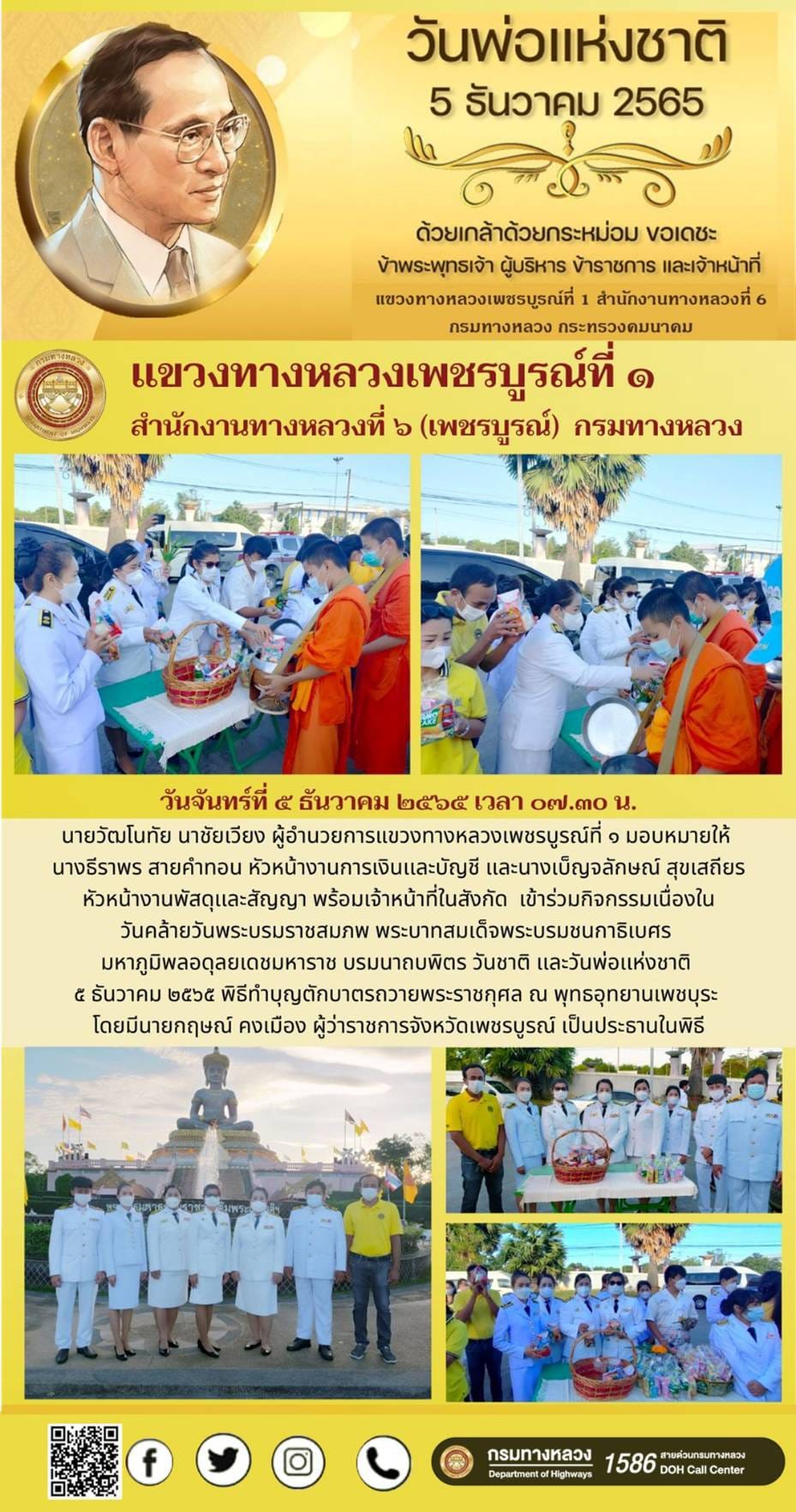 วันจันทร์ที่ ๕ ธันวาคม ๒๕๖๕ เวลา ๐๗.๓o น. นายวัฒโนทัย นาชัยเวียง ผู้อำนวยการแขวงทางหลวงเพชรบูรณ์ที่ ๑ มอบหมายให้ นางธีราพร สายคำทอน หัวหน้างานการเงินเเละบัญชี เเละนางเบ็ญจลักษณ์ สุขเสถียร หัวหน้างานพัสดุเเละสัญญา พร้อมเจ้าหน้าที่ในสังกัด เข้าร่วมกิจกรรมเนื่องในวันคล้ายวันพระบรมราชสมภพ พระบาทสมเด็จพระบรมชนกาธิเบศร มหาภูมิพลอดุลยเดชมหาราช บรมนาถบพิตร วันชาติ เเละวันพ่อเเห่งชาติ ๕ ธันวาคม ๒๕๖๕ พิธีทำบุญตักบาตรถวายพระราชกุศล ณ พุทธอุทยานเพชบุระ โดยมีนายกฤษณ์ คงเมือง ผู้ว่าราชการจังหวัดเพชรบูรณ์ เป็นประธานในพิธี