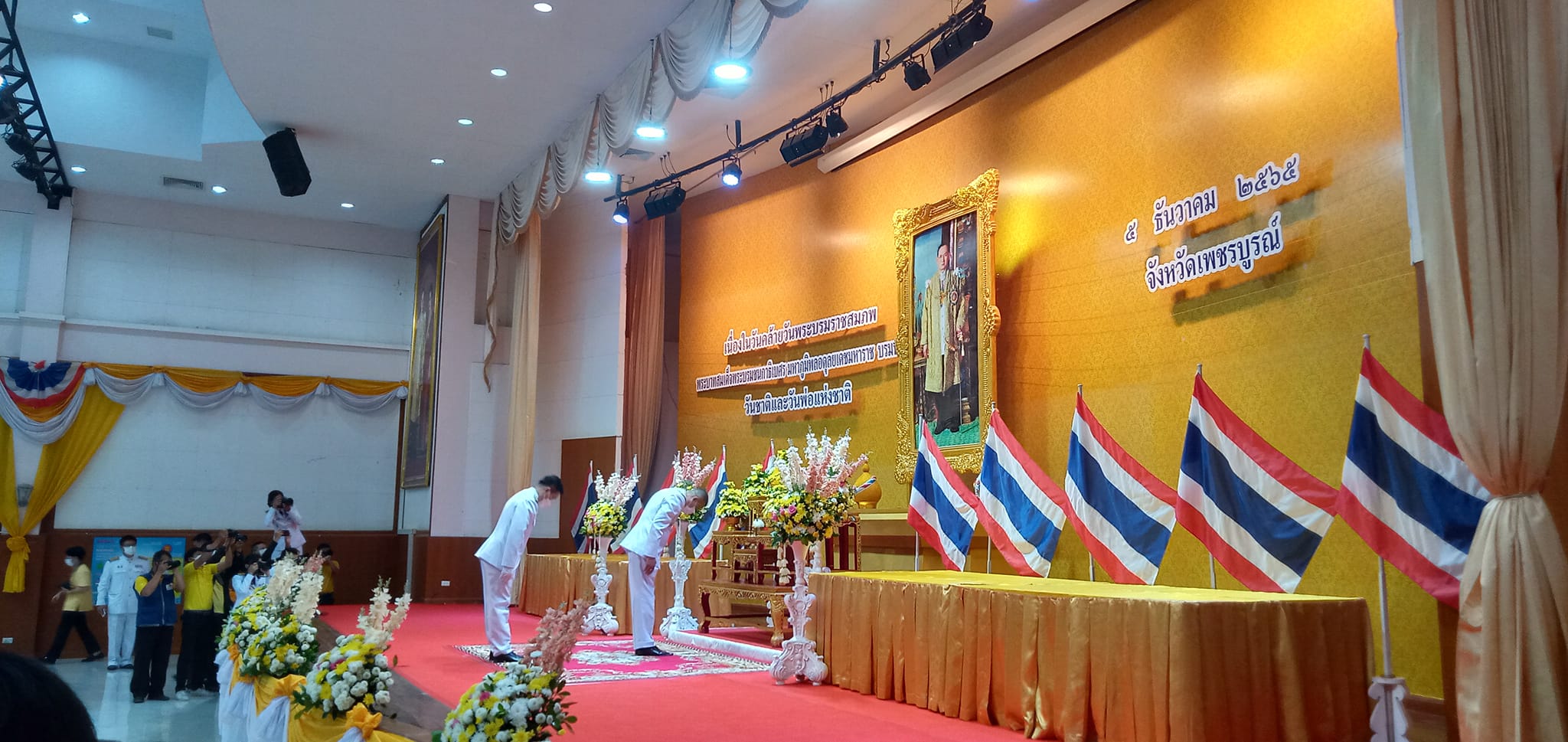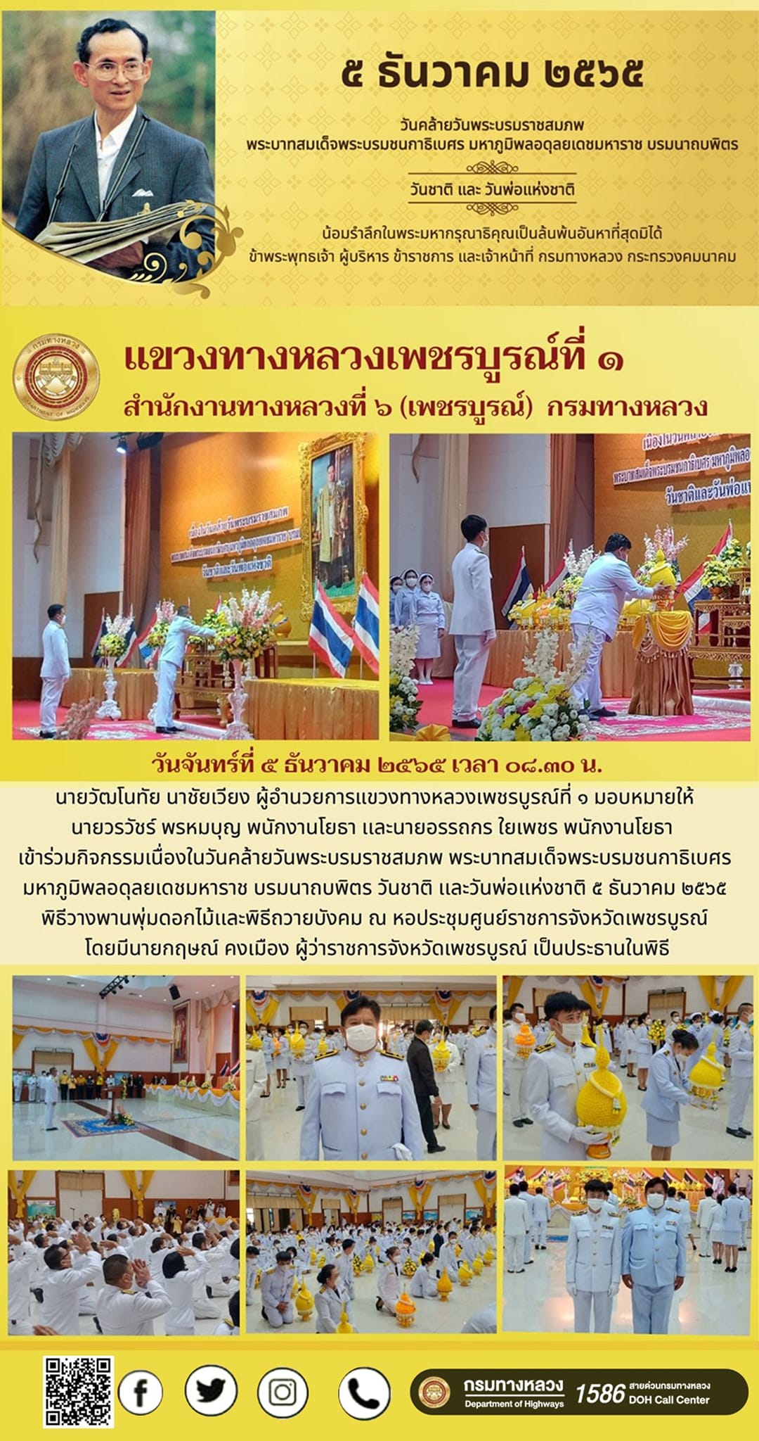 วันจันทร์ที่ ๕ ธันวาคม ๒๕๖๕ เวลา ๐๘.๓o น. นายวัฒโนทัย นาชัยเวียง ผู้อำนวยการแขวงทางหลวงเพชรบูรณ์ที่ ๑ มอบหมายให้ นายวรวัชร์ พรหมบุญ พนักงานโยธา เเละนายอรรถกร ใยเพชร พนักงานโยธา เข้าร่วมกิจกรรมเนื่องในวันคล้ายวันพระบรมราชสมภพ พระบาทสมเด็จพระบรมชนกาธิเบศร มหาภูมิพลอดุลยเดชมหาราช บรมนาถบพิตร วันชาติ เเละวันพ่อเเห่งชาติ ๕ ธันวาคม ๒๕๖๕ พิธีวางพานพุ่มดอกไม้เเละพิธีถวายบังคม ณ หอประชุมศูนย์ราชการจังหวัดเพชรบูรณ์ โดยมีนายกฤษณ์ คงเมือง ผู้ว่าราชการจังหวัดเพชรบูรณ์ เป็นประธานในพิธี