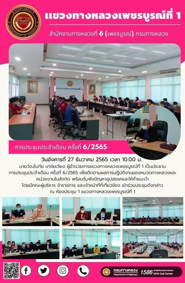 วันอังคารที่ 27 ธันวาคม 2565 เวลา 10.00 น. นายวัฒโนทัย นาชัยเวียง ผู้อำนวยการแขวงทางหลวงเพชรบูรณ์ที่ 1 เป็นประธาน การประชุมประจำเดือน ครั้งที่ 6/2565 เพื่อติดตามผลการปฏิบัติงานของหมวดทางหลวงและหน่วยงานในสังกัด พร้อมรับฟังปัญหาอุปสรรคและให้คำแนะนำ โดยมีคณะผู้บริหาร ข้าราชการ และเจ้าหน้าที่ที่เกี่ยวข้อง เข้าร่วมประชุมดังกล่าว ณ ห้องประชุม 1 แขวงทางหลวงเพชรบูรณ์ที่ 1