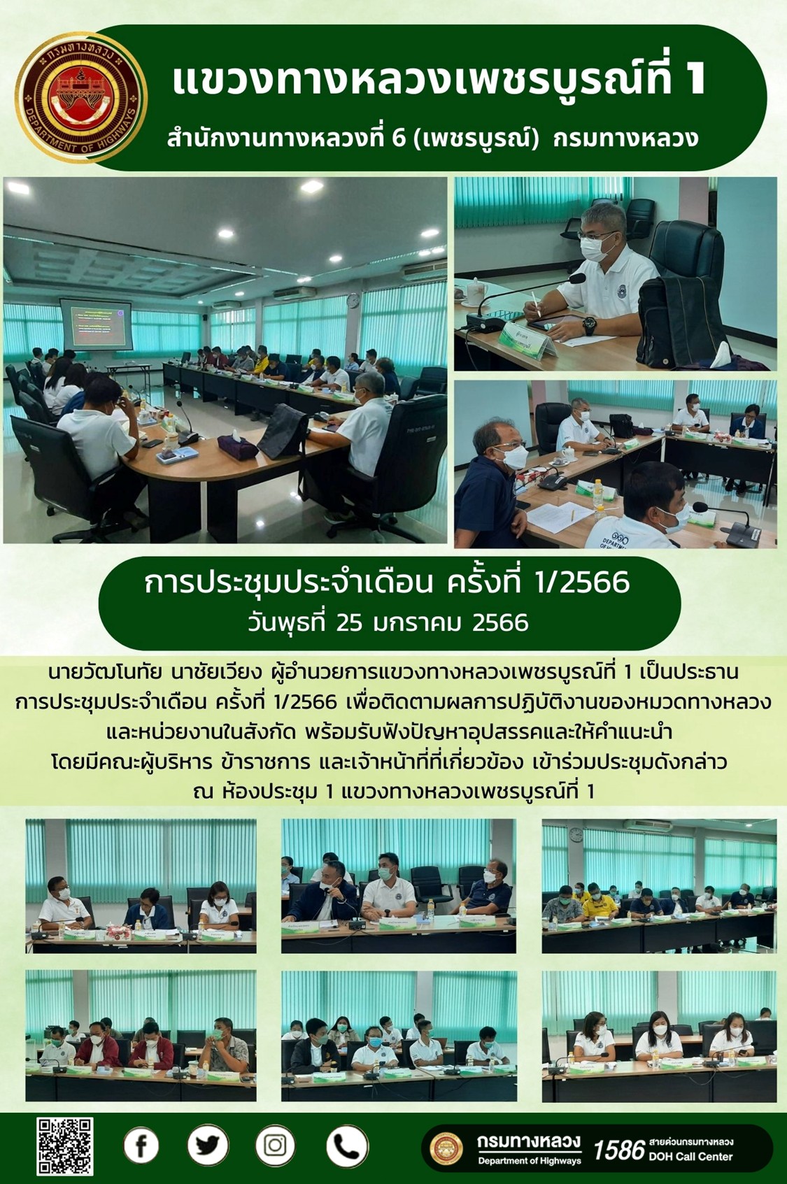 วันพุธที่ 25 มกราคม 2566 นายวัฒโนทัย นาชัยเวียง ผู้อำนวยการแขวงทางหลวงเพชรบูรณ์ที่ 1 เป็นประธานการประชุมประจำเดือน ครั้งที่ 1/2566 เพื่อติดตามผลการปฏิบัติงานของหมวดทางหลวงและหน่วยงานในสังกัด พร้อมรับฟังปัญหาอุปสรรคและให้คำแนะนำ โดยมีคณะผู้บริหาร ข้าราชการ และเจ้าหน้าที่ที่เกี่ยวข้อง เข้าร่วมประชุมดังกล่าว ณ ห้องประชุม 1 แขวงทางหลวงเพชรบูรณ์ที่ 1