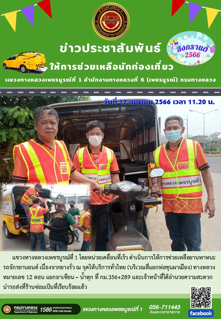 วันที่ 12 เมษายน 2566 เวลา 11.20 น. แขวงทางหลวงเพชรบูรณ์ที่ 1 โดยหน่วยเคลื่อนที่เร็ว ดำเนินการให้การช่วยเหลือยานพาหนะ รถจักรยานยนต์ เนื่องจากยางรั่ว ณ จุดให้บริการทั่วไทย (บริเวณสี่แยกพ่อขุนผาเมือง) ทางหลวงหมายเลข 12 ตอน แยกอาเซียน – น้ำดุก ที่ กม.356+289 และเจ้าหน้าที่ได้อำนวยความสะดวก นำรถส่งที่ร้านซ่อมเป็นที่เรียบร้อยแล้ว