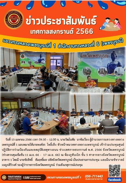 วันที่ 13 เมษายน 2566 เวลา 09.30 – 12.00 น. นายวัฒโนทัย นาชัยเวียง ผู้อำนวยการแขวงทางหลวงเพชรบูรณ์ที่ 1 มอบหมายให้นายพงศ์ธร โพธิ์เส็ง หัวหน้าหมวดทางหลวงเพชรบูรณ์ เข้าร่วมประชุมศูนย์ปฏิบัติการร่วมป้องกันและลดอุบัติเหตุทางถนน ช่วงเทศกาลสงกรานต์ พ.ศ. 2566 จังหวัดเพชรบูรณ์ (ช่วงควบคุมเข้มข้น 11 เม.ย. 66 - 17 เม.ย. 66) ณ ห้องภูทับเบิก ชั้น 5 ศาลากลางจังหวัดเพชรบูรณ์ อาคาร 1 โดยมี นายชัยสิทธิ์ สัมฤทธิ์ผล ปลัดจังหวัดเพชรบูรณ์ เป็นประธานการประชุม เเละมีนายชัชวาลย์ เบญจสิริวงศ์ รองผู้ว่าราชการจังหวัดเพชรบูรณ์ ร่วมสังเกตุการณ์ประชุม