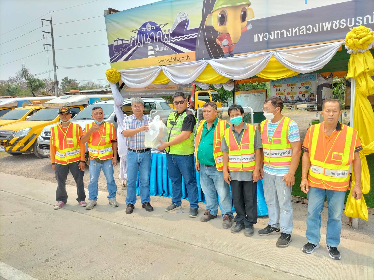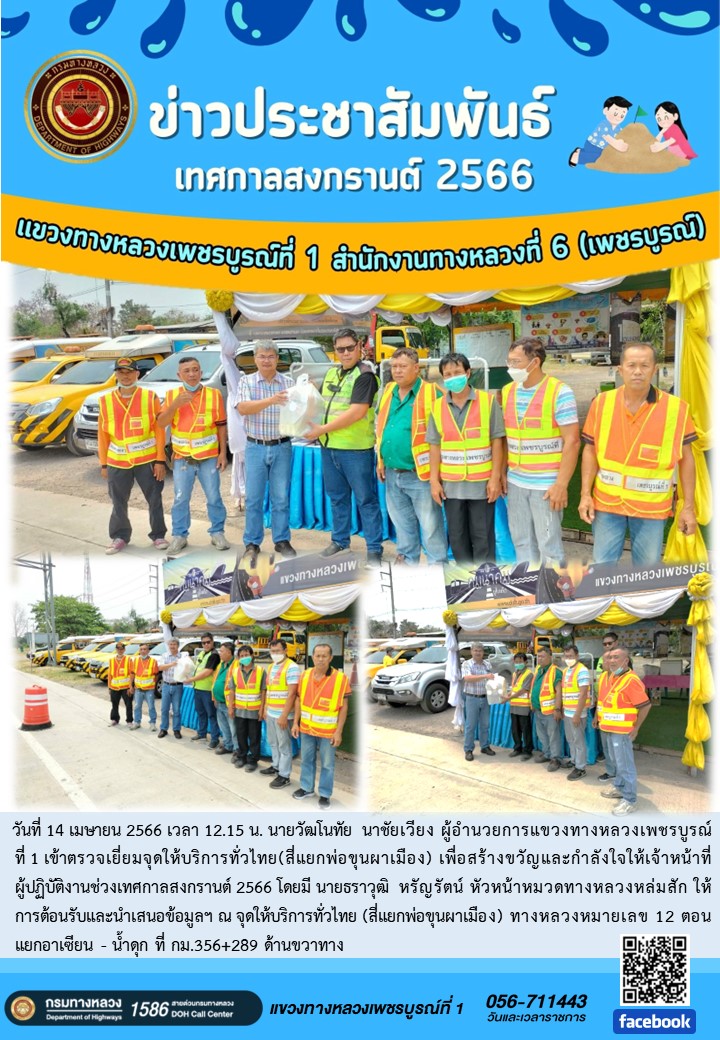 วันที่ 14 เมษายน 2566 เวลา 12.15 น. นายวัฒโนทัย นาชัยเวียง ผู้อำนวยการแขวงทางหลวงเพชรบูรณ์ ที่ 1 เข้าตรวจเยี่ยมจุดให้บริการทั่วไทย(สี่แยกพ่อขุนผาเมือง) เพื่อสร้างขวัญและกำลังใจให้เจ้าหน้าที่ผู้ปฏิบัติงานช่วงเทศกาลสงกรานต์ 2566 โดยมี นายธราวุฒิ หรัญรัตน์ หัวหน้าหมวดทางหลวงหล่มสัก ให้การต้อนรับและนำเสนอข้อมูลฯ ณ จุดให้บริการทั่วไทย (สี่แยกพ่อขุนผาเมือง) ทางหลวงหมายเลข 12 ตอน แยกอาเซียน - น้ำดุก ที่ กม.356+289 ด้านขวาทาง