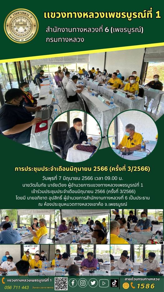 วันพุธที่ 7 มิถุนายน 2566 เวลา 09.00 น.นายวัฒโนทัย นาชัยเวียง ผู้อำนวยการแขวงทางหลวงเพชรบูรณ์ที่ 1เข้าร่วมประชุมประจำเดือนมิถุนายน 2566 (ครั้งที่ 3/2566)โดยมี นายอภิชาต อุปสิทธิ์ ผู้อำนวยการสำนักงานทางหลวงที่ 6 เป็นประธาน ณ ห้องประชุมหมวดทางหลวงเขาค้อ จ.เพชรบูรณ์