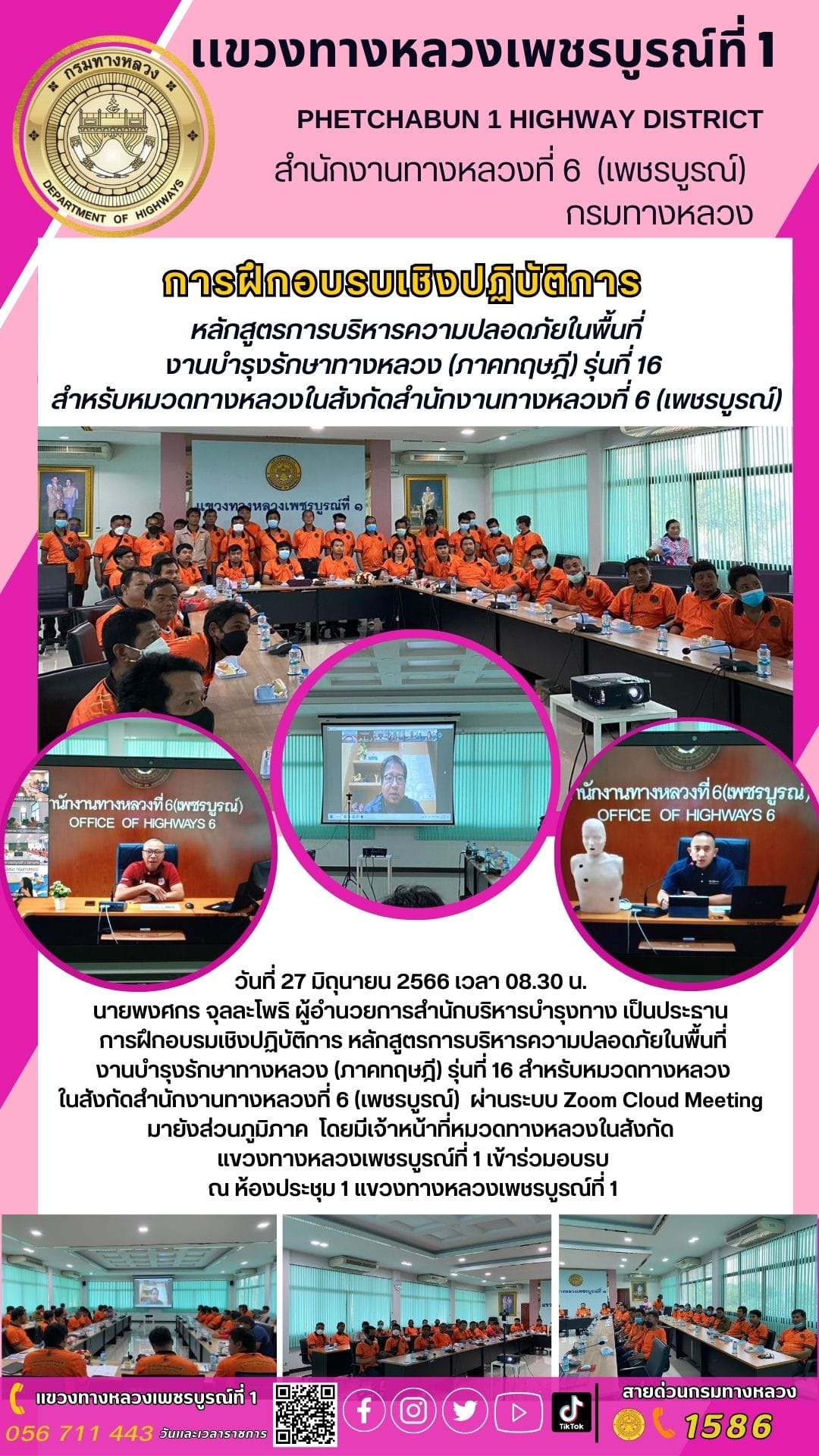 วันที่ 27 มิถุนายน 2566 เวลา 08.30 น. นายพงศกร จุลละโพธิ ผู้อำนวยการสำนักบริหารบำรุงทาง เป็นประธาน การฝึกอบรมเชิงปฏิบัติการ หลักสูตรการบริหารความปลอดภัยในพื้นที่งานบำรุงรักษาทางหลวง (ภาคทฤษฎี) รุ่นที่ 16 สำหรับหมวดทางหลวงในสังกัดสำนักงานทางหลวงที่ 6 (เพชรบูรณ์) ผ่านระบบ Zoom Cloud Meeting มายังส่วนภูมิภาค โดยมีเจ้าหน้าที่หมวดทางหลวงในสังกัด เเขวงทางหลวงเพชรบูรณ์ที่ 1 เข้าร่วมอบรบ ณ ห้องประชุม 1 แขวงทางหลวงเพชรบูรณ์ที่ 1