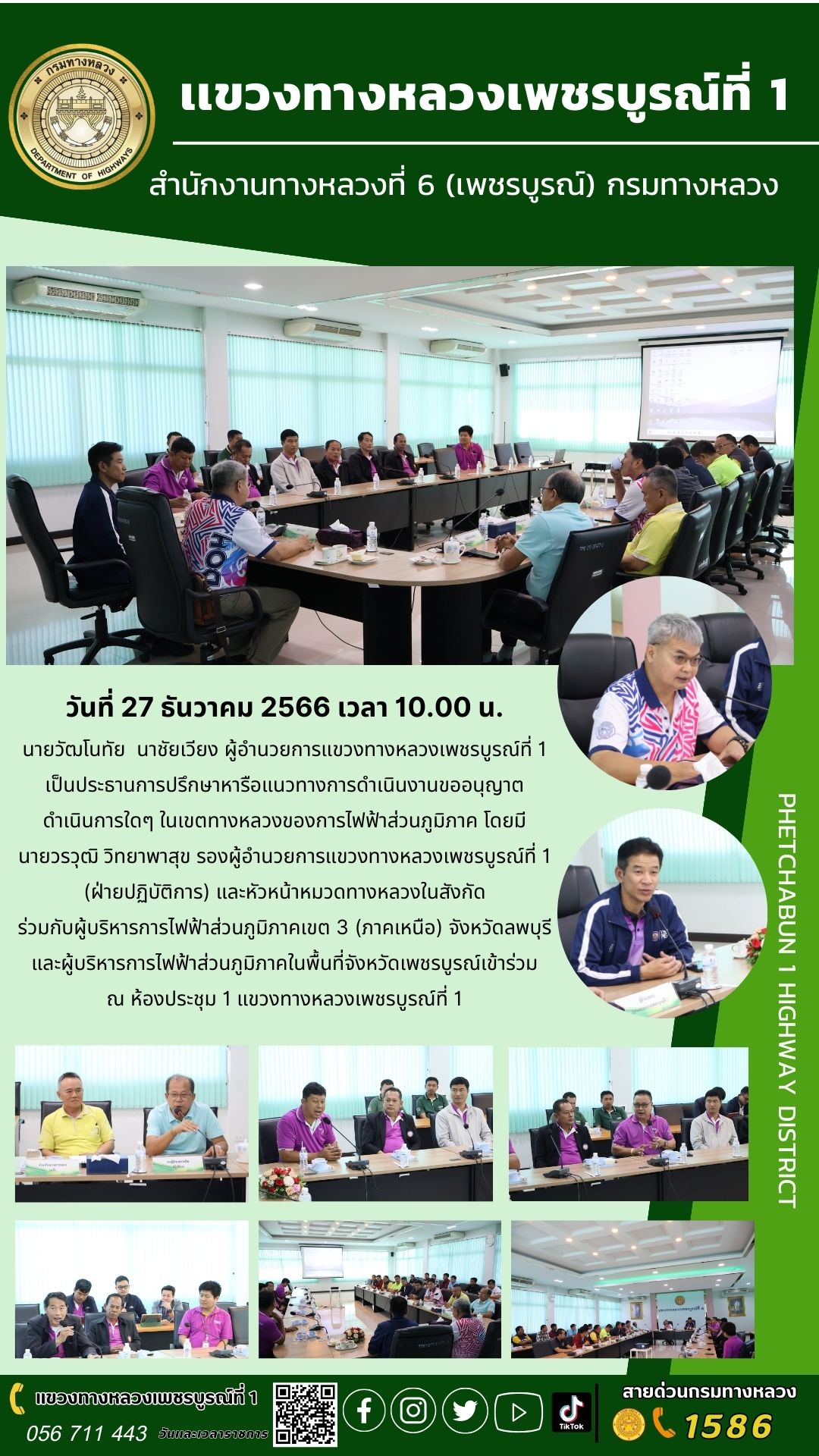 วันที่ 27 ธันวาคม 2566 เวลา 10.00 น. นายวัฒโนทัย นาชัยเวียง ผู้อำนวยการแขวงทางหลวงเพชรบูรณ์ที่ 1 เป็นประธานการปรึกษาหารือแนวทางการดำเนินงานขออนุญาตดำเนินการใดๆ ในเขตทางหลวงของการไฟฟ้าส่วนภูมิภาค โดยมีนายวรวุฒิ วิทยาพาสุข รองผู้อำนวยการแขวงทางหลวงเพชรบูรณ์ที่ 1 (ฝ่ายปฏิบัติการ) และหัวหน้าหมวดทางหลวงในสังกัด ร่วมกับผู้บริหารการไฟฟ้าส่วนภูมิภาคเขต 3 (ภาคเหนือ) จังหวัดลพบุรี และผู้บริหารการไฟฟ้าส่วนภูมิภาคในพื้นที่จังหวัดเพชรบูรณ์เข้าร่วม ณ ห้องประชุม 1 แขวงทางหลวงเพชรบูรณ์ที่ 1