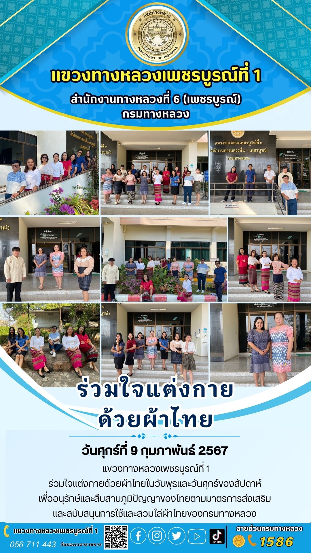 วันศุกร์ที่ 9 กุมภาพันธ์ 2567แขวงทางหลวงเพชรบูรณ์ที่ 1 ร่วมใจแต่งกายด้วยผ้าไทยในวันพุธและวันศุกร์ของสัปดาห์ เพื่ออนุรักษ์และสืบสานภูมิปัญญาของไทยตามมาตรการส่งเสริมและสนับสนุนการใช้และสวมใส่ผ้าไทยของกรมทางหลวง