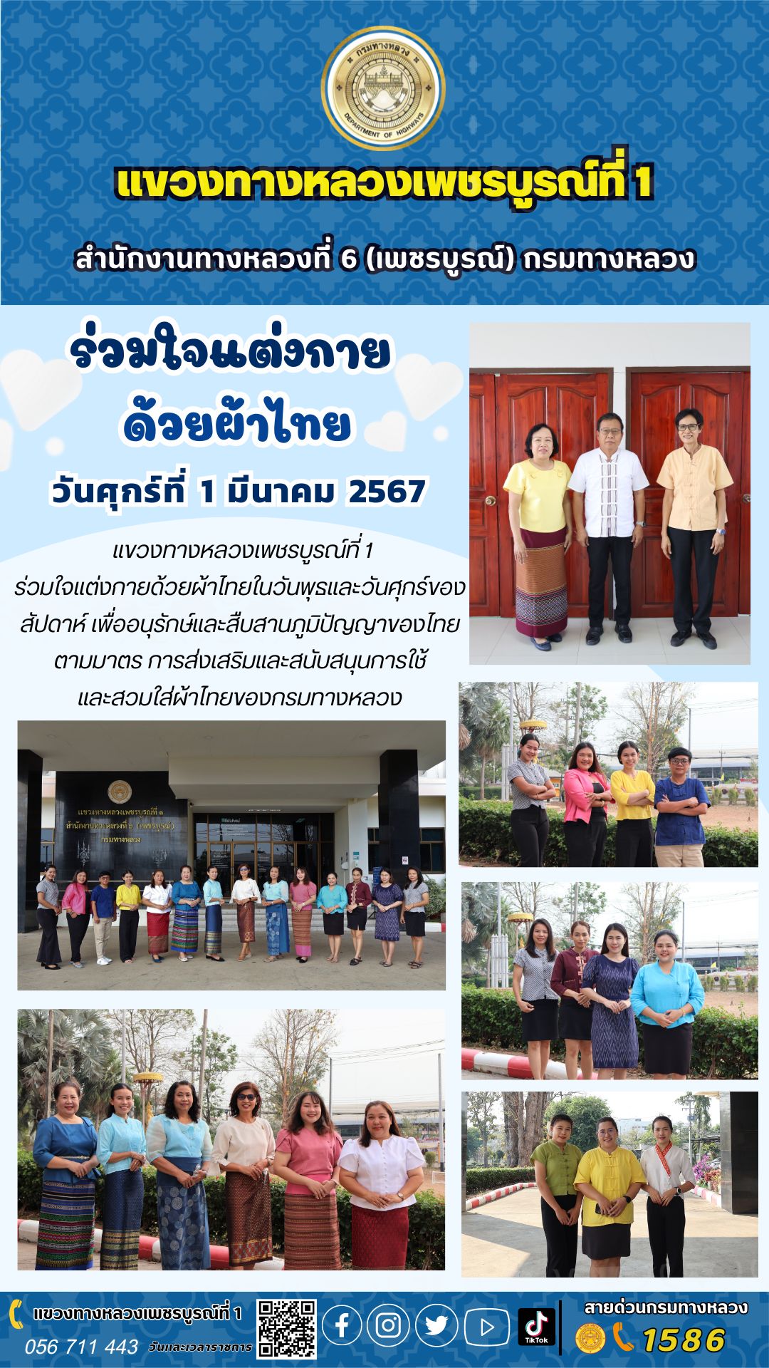 แขวงทางหลวงเพชรบูรณ์ที่ 1 ร่วมใจแต่งกายด้วยผ้าไทยในวันพุธและวันศุกร์ของสัปดาห์ เพื่ออนุรักษ์และสืบสานภูมิปัญญาของไทยตามมาตรการส่งเสริมและสนับสนุนการใช้และสวมใส่ผ้าไทยของกรมทางหล