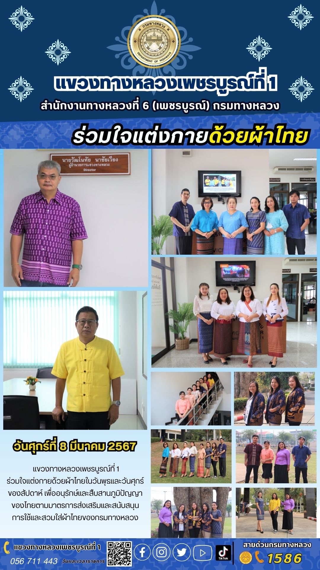 แขวงทางหลวงเพชรบูรณ์ที่ 1 ร่วมใจแต่งกายด้วยผ้าไทยในวันพุธและวันศุกร์ของสัปดาห์ เพื่ออนุรักษ์และสืบสานภูมิปัญญาของไทยตามมาตรการส่งเสริมและสนับสนุนการใช้และสวมใส่ผ้าไทยของกรมทางหลวง