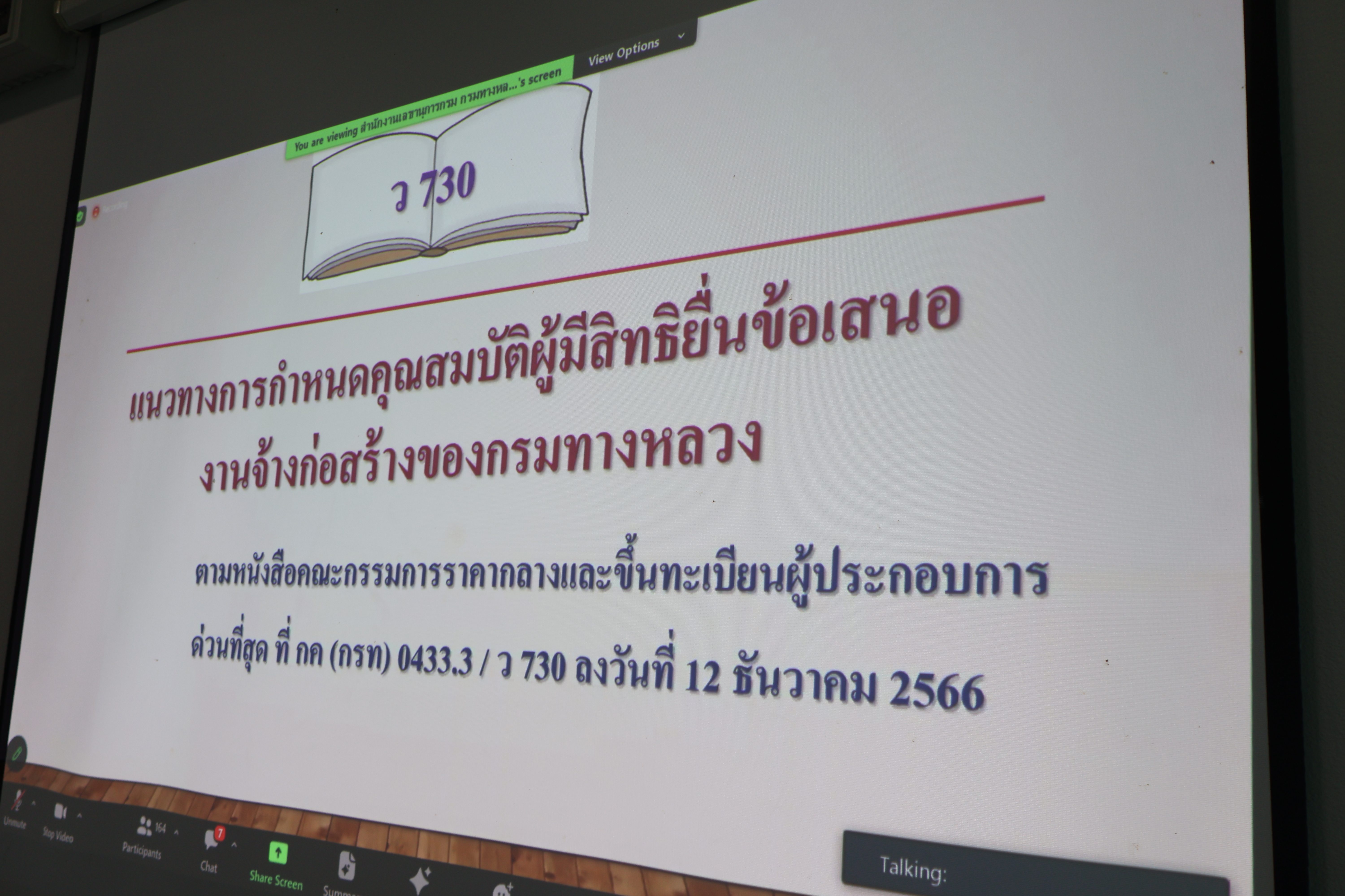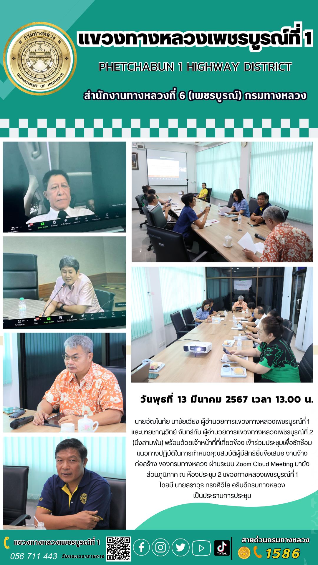 วันพุธที่ 13 มีนาคม 2567 เวลา 13.00 น. นายวัฒโนทัย นาชัยเวียง ผู้อำนวยการแขวงทางหลวงเพชรบูรณ์ที่ 1 และนายชาญวิทย์ จันทร์ทับผู้อำนวยการแขวงทางหลวงเพชรบูรณ์ที่ 2 (บึงสามพัน) พร้อมด้วยเจ้าหน้าที่ที่เกี่ยวข้อง เข้าร่วมประชุมเพื่อซักซ้อมแนวทางปฏิบัติในการกำหนดคุณสมบัติผู้มีสิทธิยื่นข้อเสนอ งานจ้างก่อสร้าง ของกรมทางหลวงผ่านระบบ Zoom Cloud Meeting มายังส่วนภูมิภาค ณ ห้องประชุม 2 แขวงทางหลวงเพชรบูรณ์ที่ 1 โดยมี นายสราวุธ ทรงศิวิไล อธิบดีกรมทางหลวง เป็นประธานการประชุม