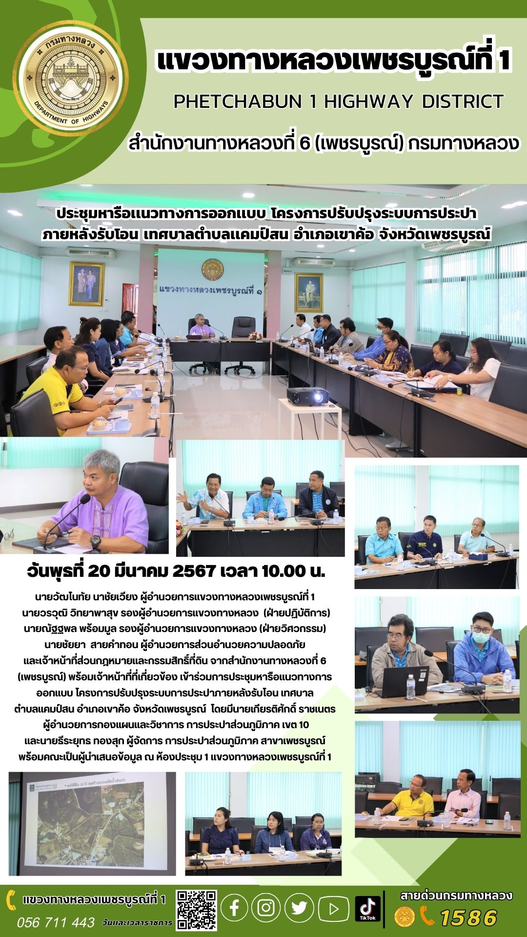 นายวัฒโนทัย นาชัยเวียง ผู้อำนวยการแขวงทางหลวงเพชรบูรณ์ที่ 1 นายวรวุฒิ วิทยาพาสุข รองผู้อำนวยการเเขวงทางหลวง (ฝ่ายปฏิบัติการ) นายณัฐฐพล พร้อมมูล รองผู้อำนวยการเเขวงทางหลวง (ฝ่ายวิศวกรรม) นายชัยยา สายคำทอน ผู้อำนวยการส่วนอำนวยความปลอดภัย เเละเจ้าหน้าที่ส่วนกฎหมายเเละกรรมสิทธิ์ที่ดิน จากสำนักงานทางหลวงที่ 6 (เพชรบูรณ์) พร้อมเจ้าหน้าที่ที่เกี่ยวข้อง เข้าร่วมการประชุมหารือเเนวทางการออกเเบบ โครงการปรับปรุงระบบการประปาภายหลังรับโอน เทศบาล ตำบลเเคมป์สน อำเภอเขาค้อ จังหวัดเพชรบูรณ์ โดยมีนายเกียรติศักดิ์ ราชเนตร ผู้อำนวยการกองเเผนเเละวิชาการ การประปาส่วนภูมิภาค เขต 10 เเละนายธีระยุทธ ทองสุก ผู้จัดการ การประปาส่วนภูมิภาค สาขาเพชรบูรณ์ พร้อมคณะเป็นผู้นำเสนอข้อมูล ณ ห้องประชุม 1 เเขวงทางหลวงเพชรบูรณ์ที่ 1
