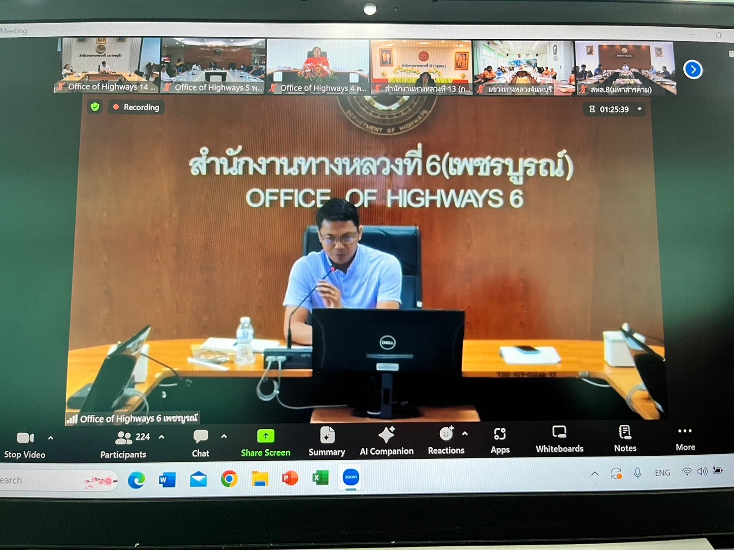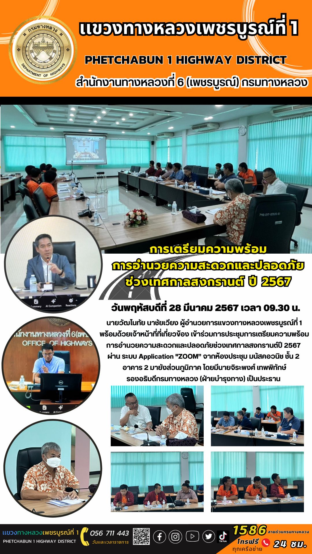 นายวัฒโนทัย นาชัยเวียง ผู้อำนวยการแขวงทางหลวงเพชรบูรณ์ที่ 1 พร้อมด้วยเจ้าหน้าที่ที่เกี่ยวข้อง เข้าร่วมการประชุมการเตรียมความพร้อมการอำนวยความสะดวกและปลอดภัยช่วงเทศกาลสงกรานต์ปี 2567 ผ่าน ระบบ Application "ZOOM” จากห้องประชุม มนัสคอวนิช ชั้น 2 อาคาร 2 มายังส่วนภูมิภาค โดยมีนายจิระพงศ์ เทพพิทักษ์ รองอธิบดีกรมทางหลวง (ฝ่ายบำรุงทาง) เป็นประธาน