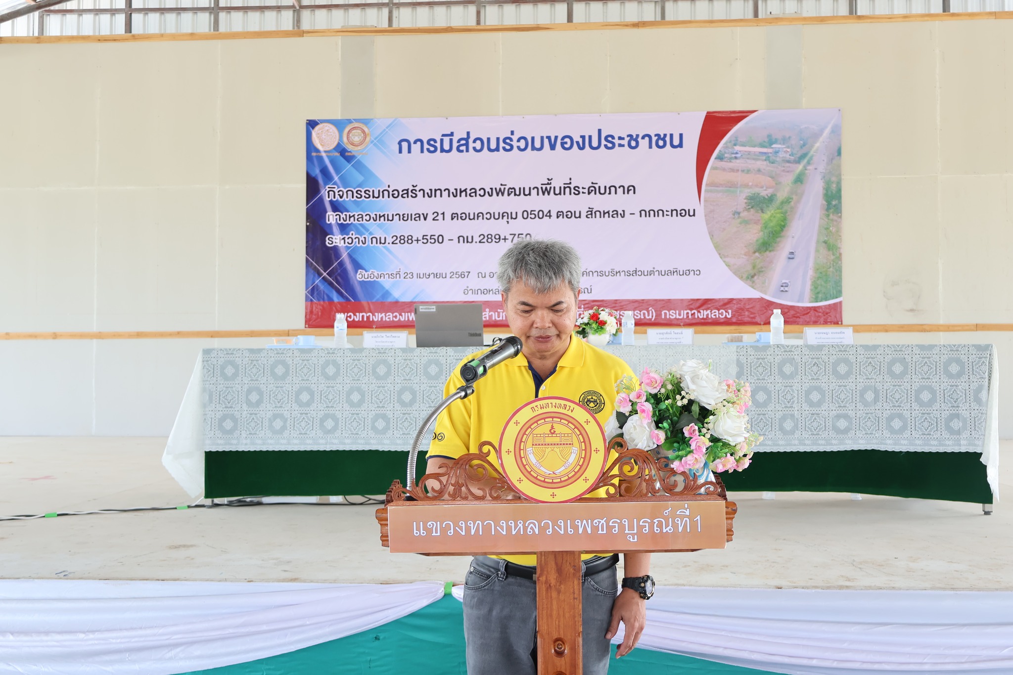 จัดการประชุมการมีส่วนร่วมของประชาชน โครงการก่อสร้างโครงข่ายทางหลวงแผ่นดิน กิจกรรมก่อสร้างทางหลวงพัฒนาพื้นที่ระดับภาค ทางหลวงหมายเลข 21 ตอนควบคุม 0504 ตอน สักหลง – กกกะทอน ระหว่าง กม.288+550 – กม.289+750